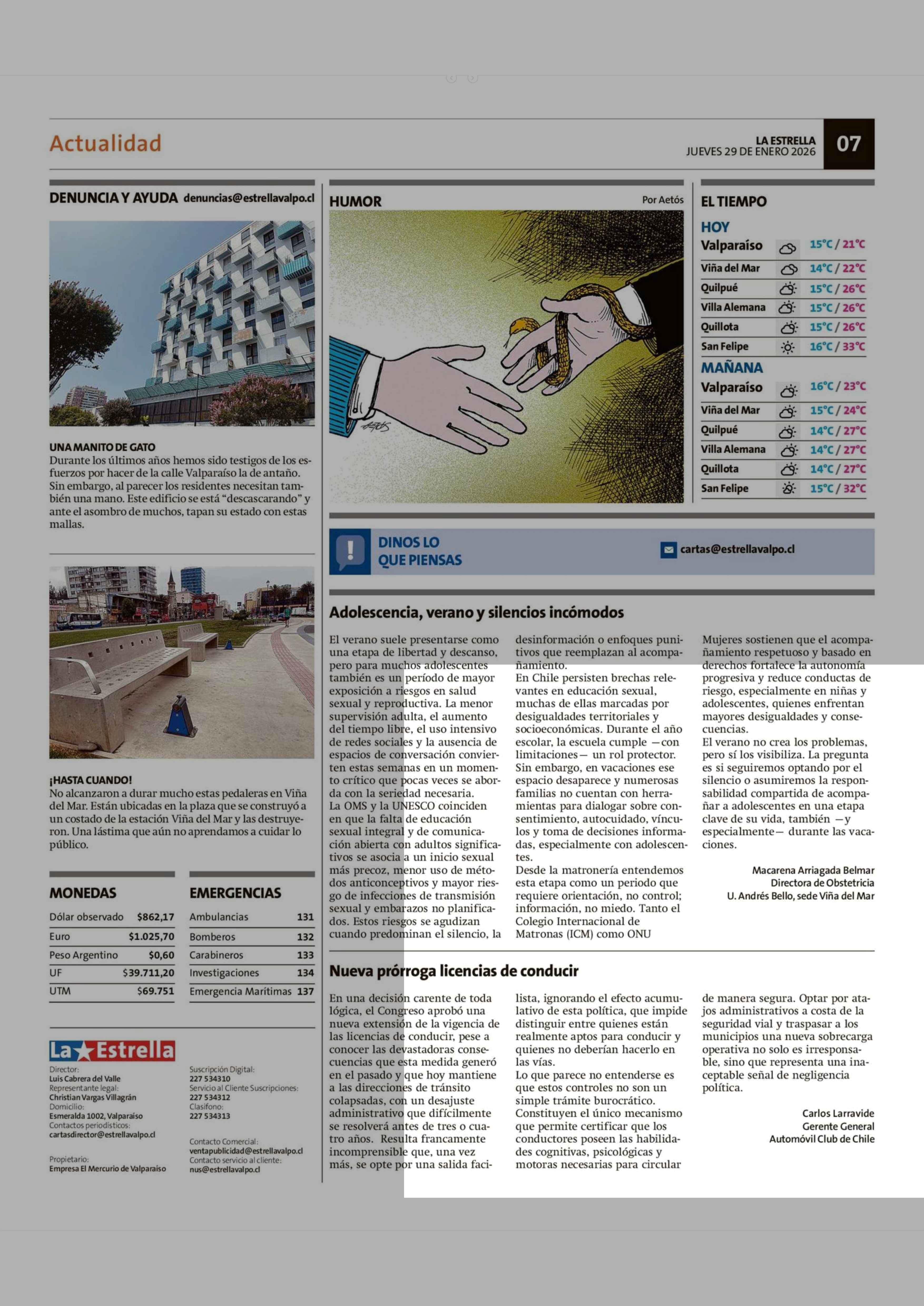 Columnas de Opinión: Adolescencia, verano y silencios incómodos 29-01-2026 La Estrella de Valparaíso |