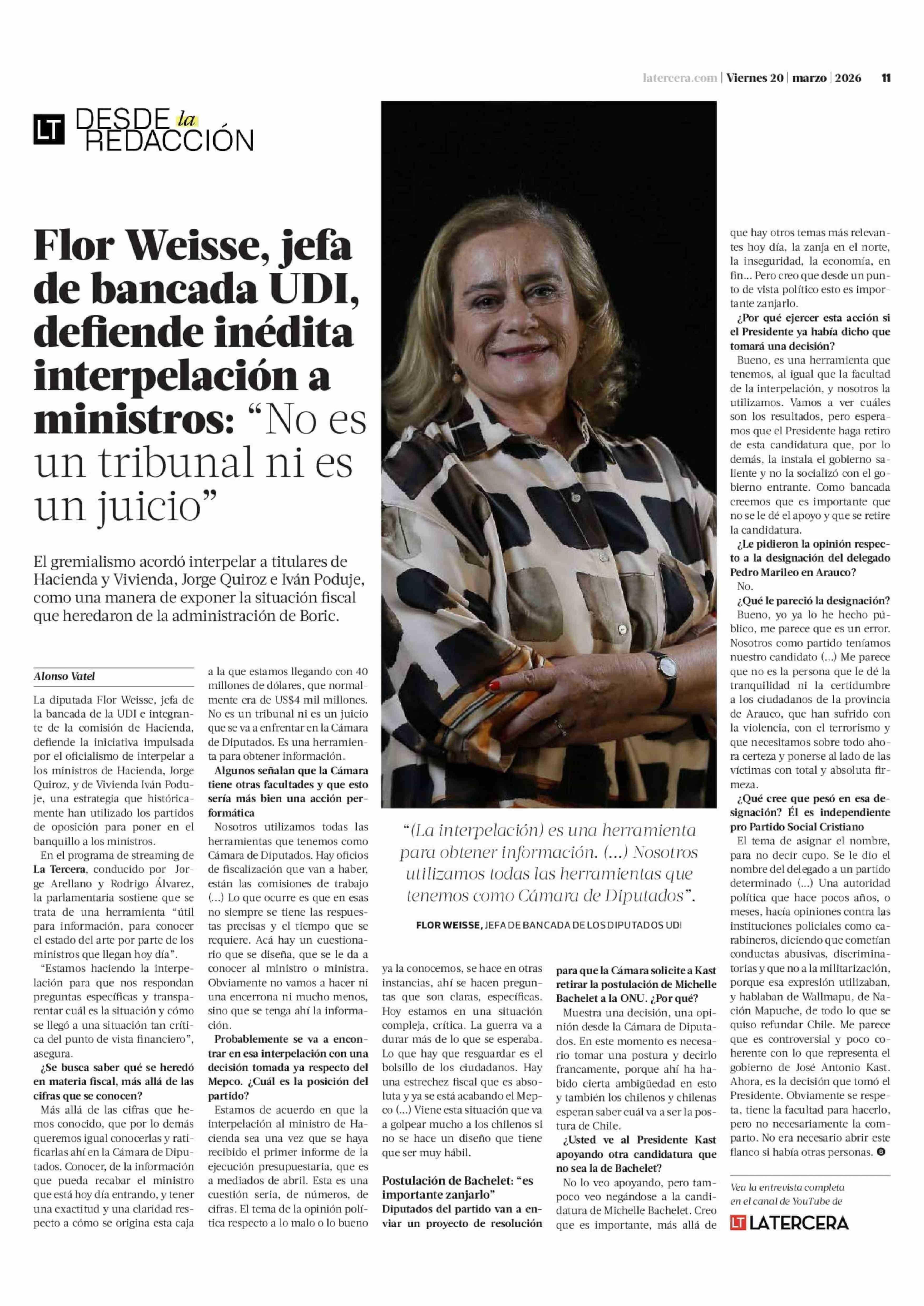 Título: Flor Weisse, jefa de bancada UDI, defiende inédita interpelación a ministros: "No es un tribunal ni es un juicio"