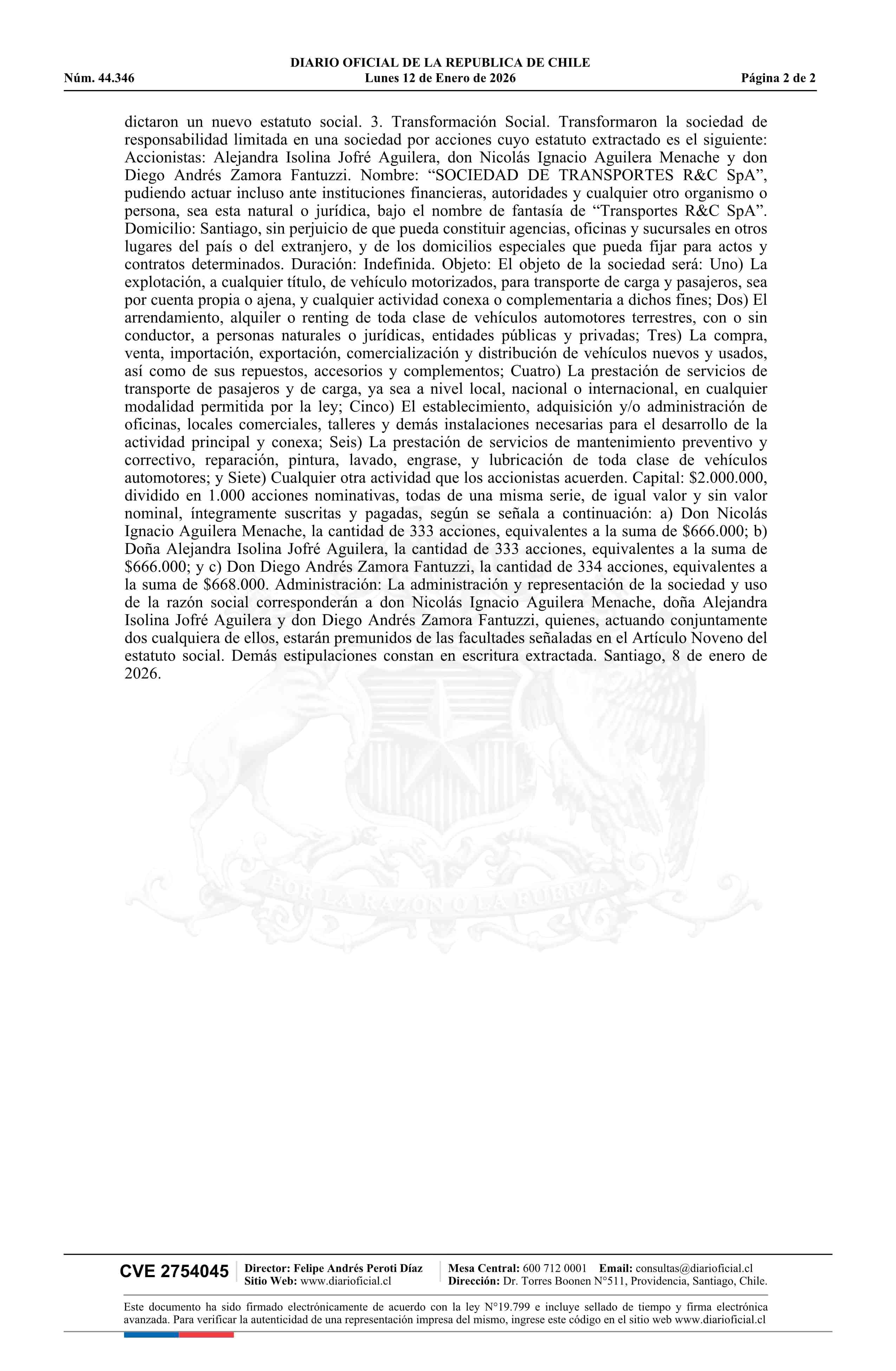 SOCIEDAD DE TRANSPORTES R&C LIMITADA 76.256.742-3* 12-01-2026 Diario Oficial Edición Electrónica |