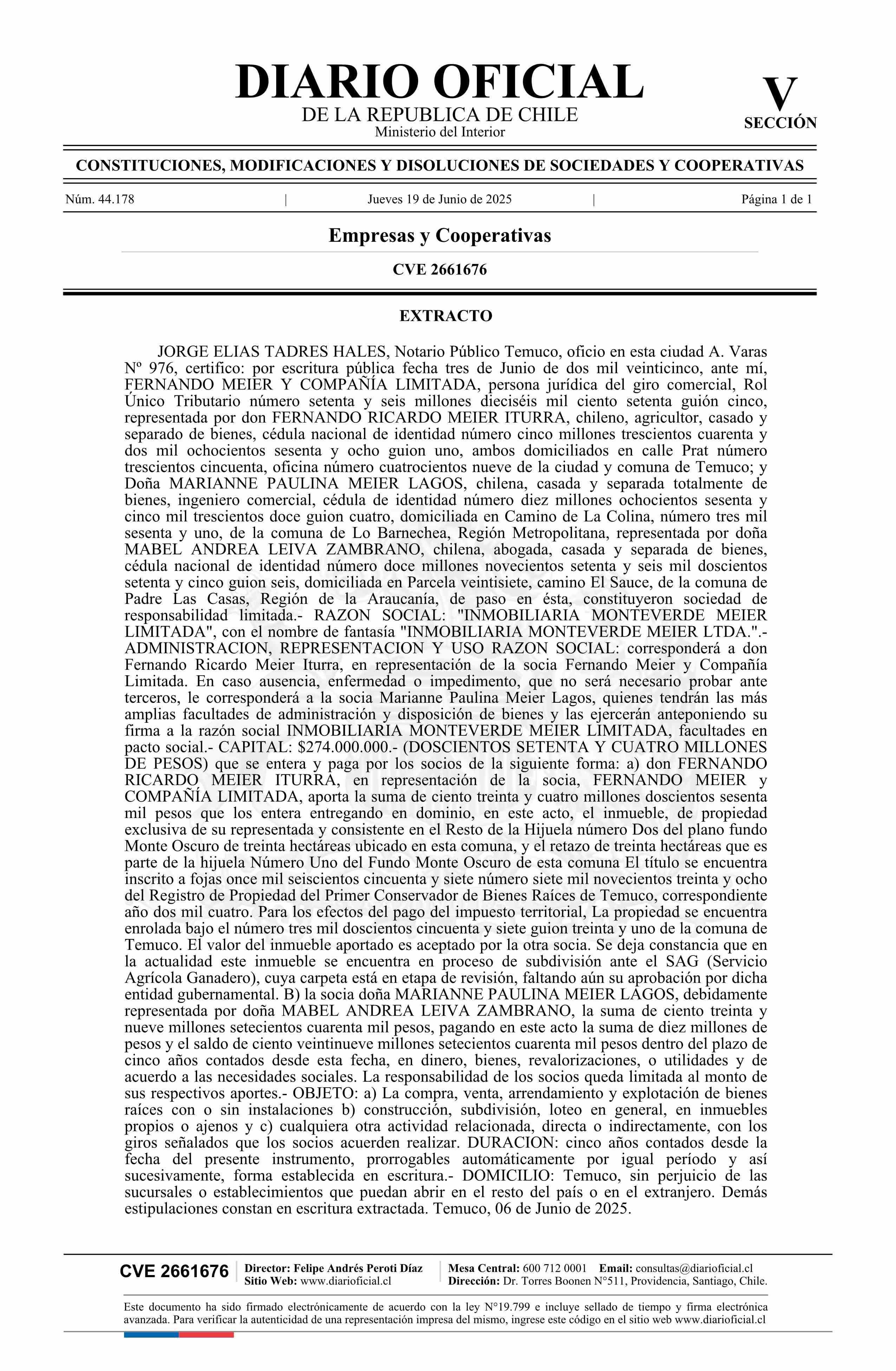 INMOBILIARIA MONTEVERDE MEIER LIMITADA 19-06-2025 Diario Oficial Edición Electrónica |