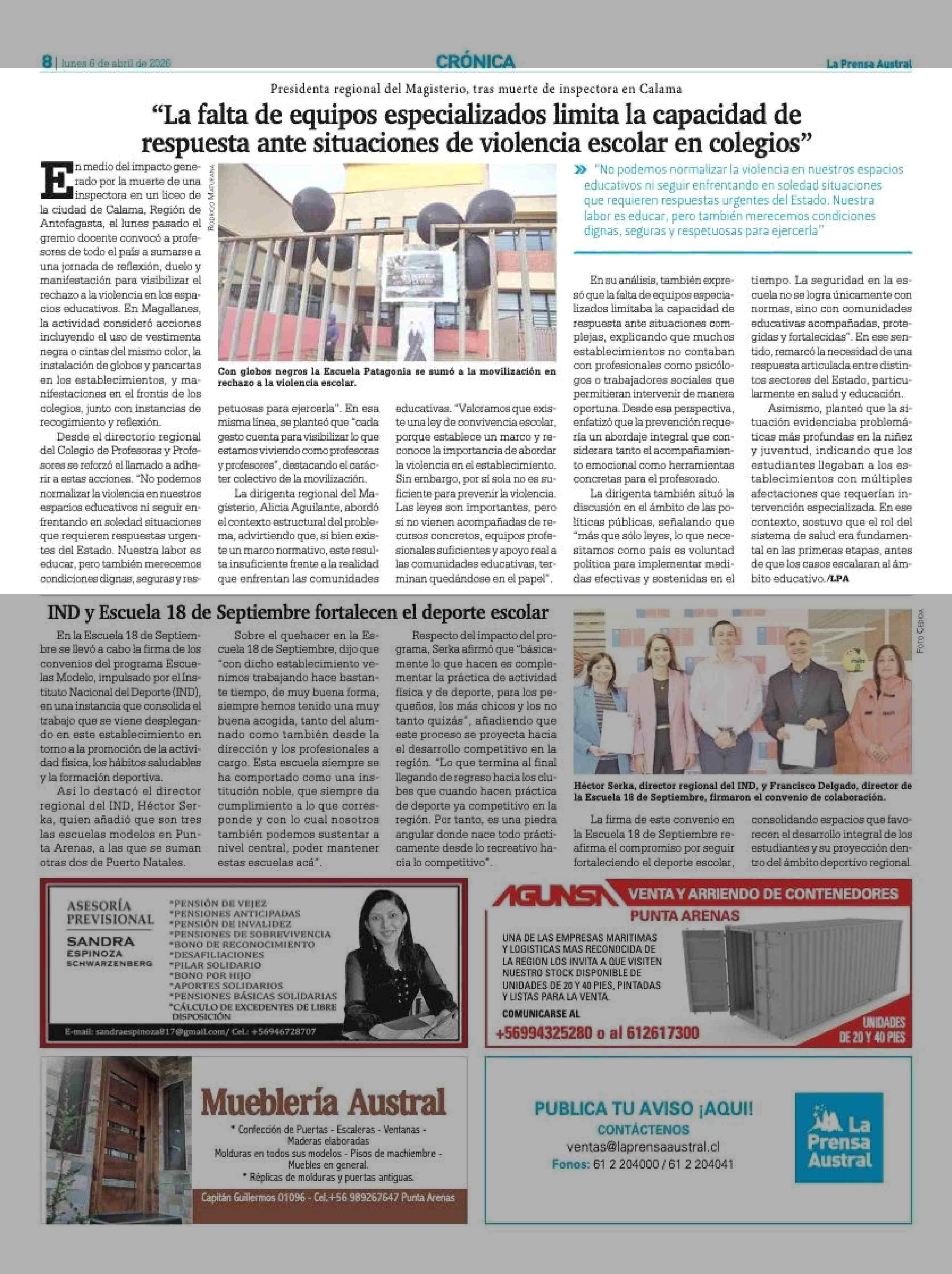 “La falta de equipos especializados limita la capacidad de respuesta ante situaciones de violencia escolar en colegios” 06-04-2026 La Prensa Austral |