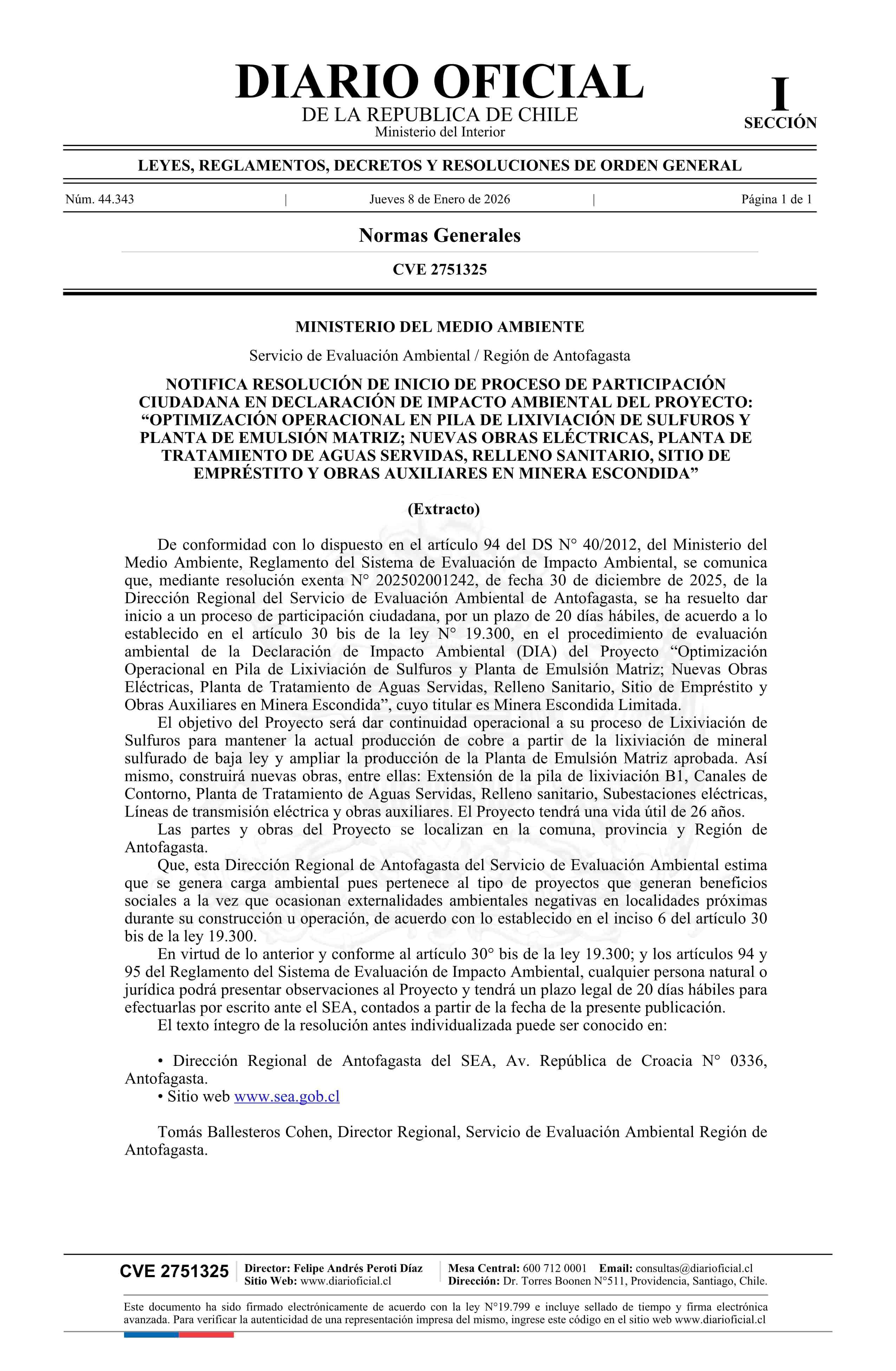 Título: Extracto de resolución exenta número 202502001242, de 2025.- Inicia proceso de participación ciudadana en Declaración de Impacto Ambiental del Proyecto Optimización Operacional en Pila de Lixiviación de Sulfuros y Planta de Emulsión Matriz; Nuevas Obras Eléctricas, Planta de Tratamiento de Aguas Ser