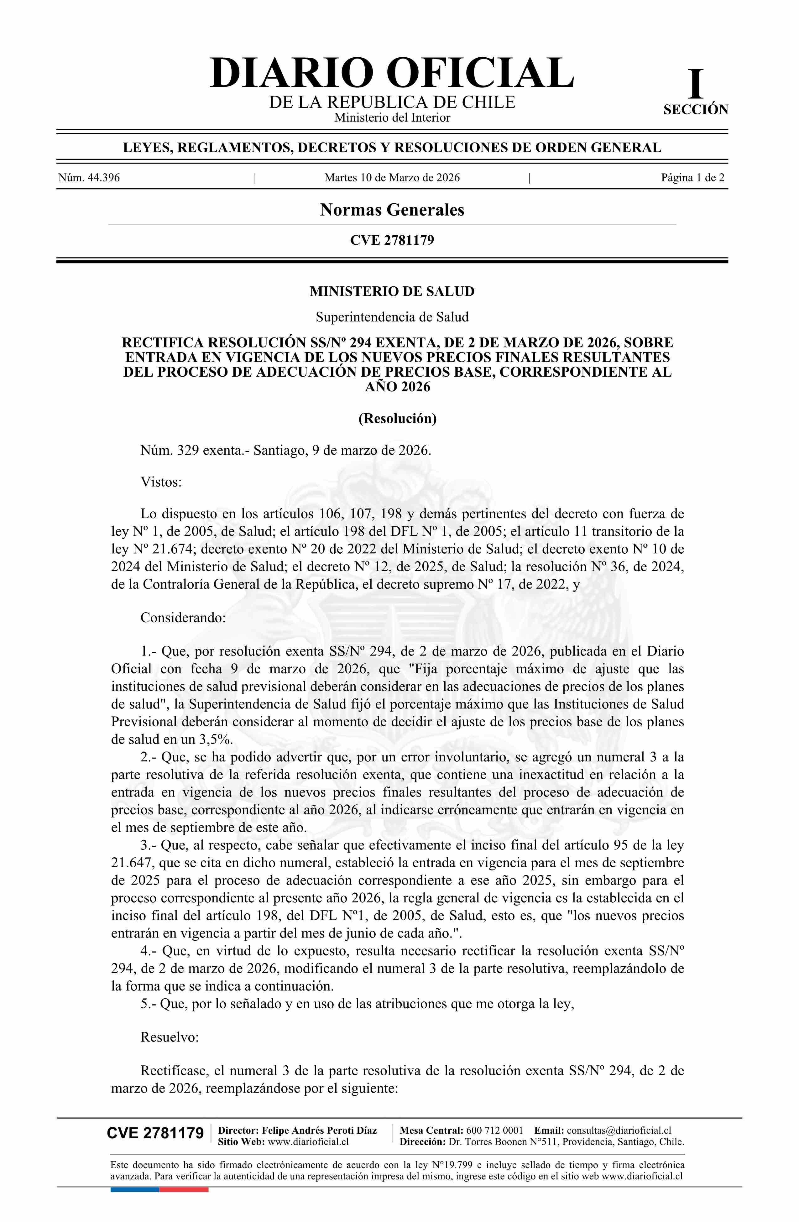 Título: Resolución exenta número 329, de 2026.- Rectifica resolución Nº 294 exenta, de 2026, sobre entrada en vigencia de los nuevos precios finales resultantes del proceso de adecuación de precios base, correspondiente al año 2026