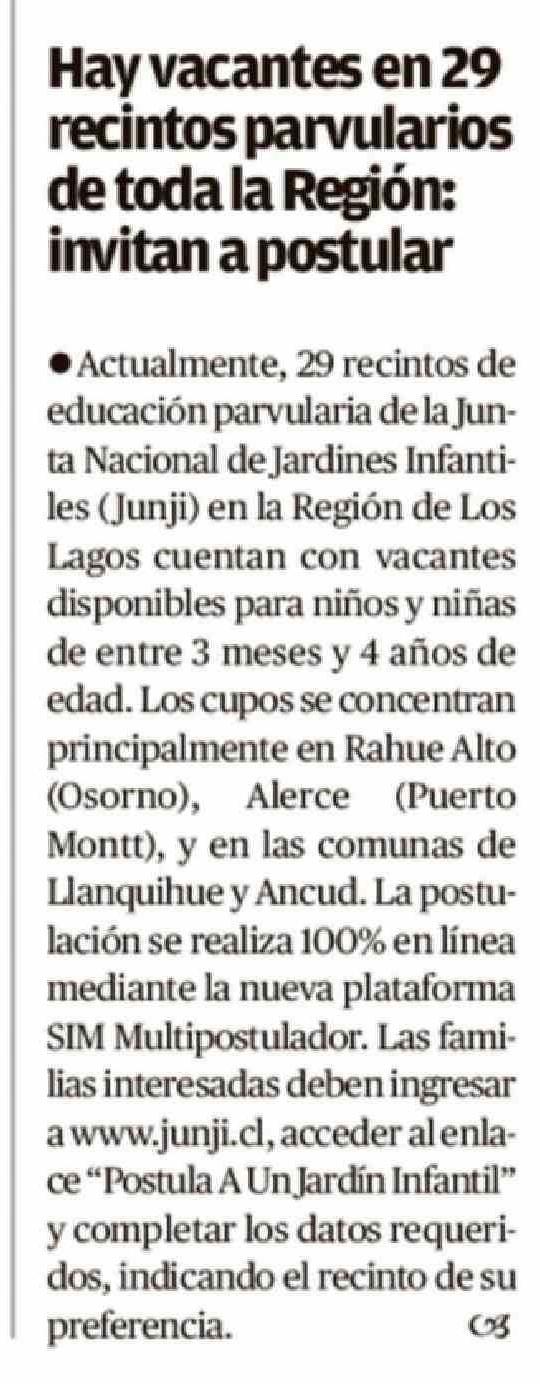 Hay vacantes en 29 recintos parvularios de toda la Región: invitan a postular 07-04-2026 El Llanquihue |