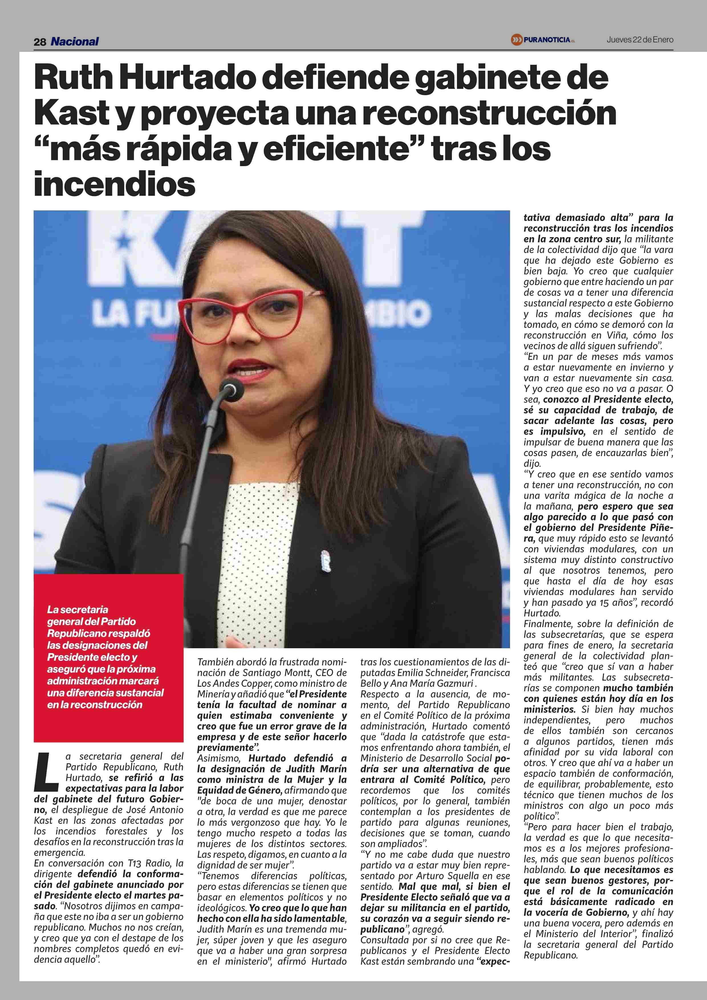 Ruth Hurtado defiende gabinete de Kast y proyecta una reconstrucción “más rápida y eficiente” tras los incendios 22-01-2026 Puranoticia.cl |