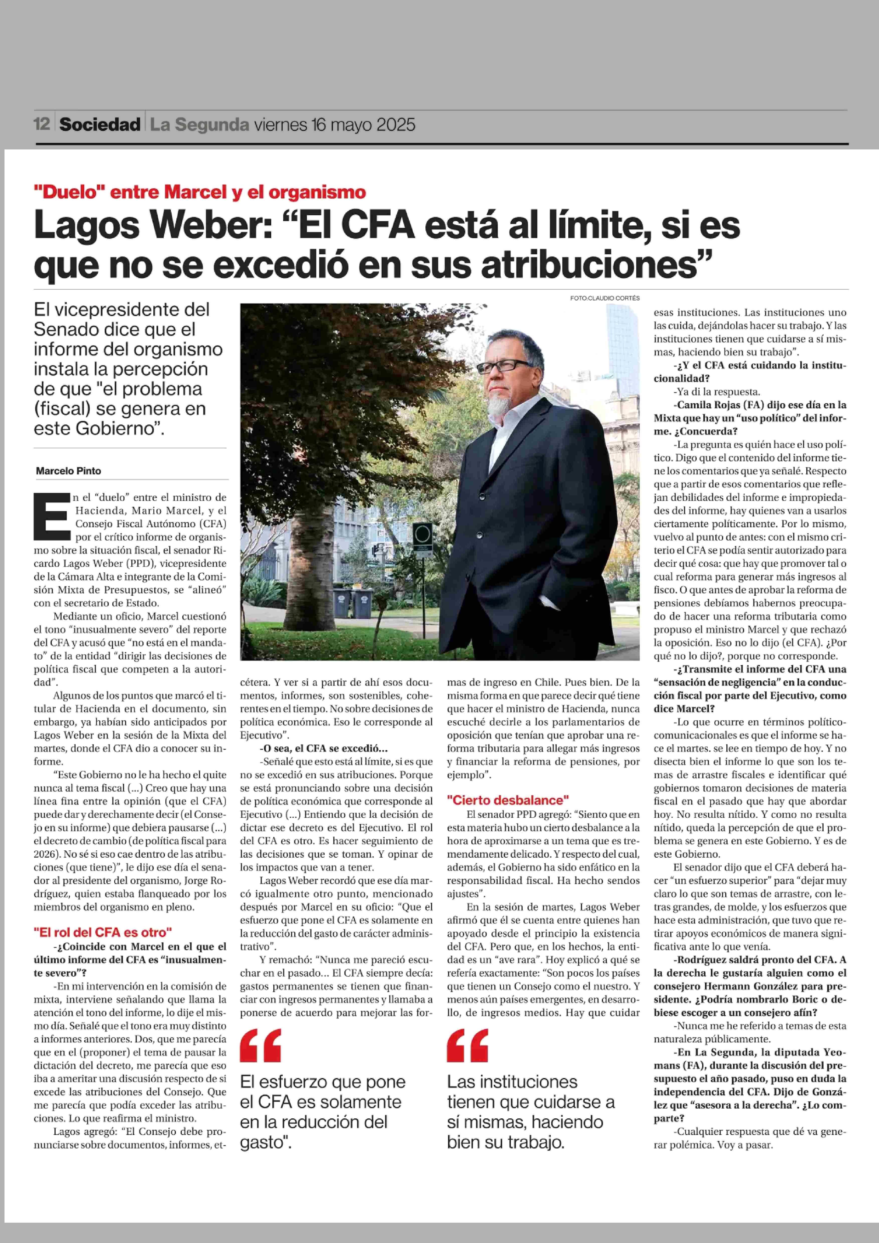 Lagos Weber: “El CFA está al límite, si es que no se excedió en sus atribuciones” 16-05-2025 La Segunda |