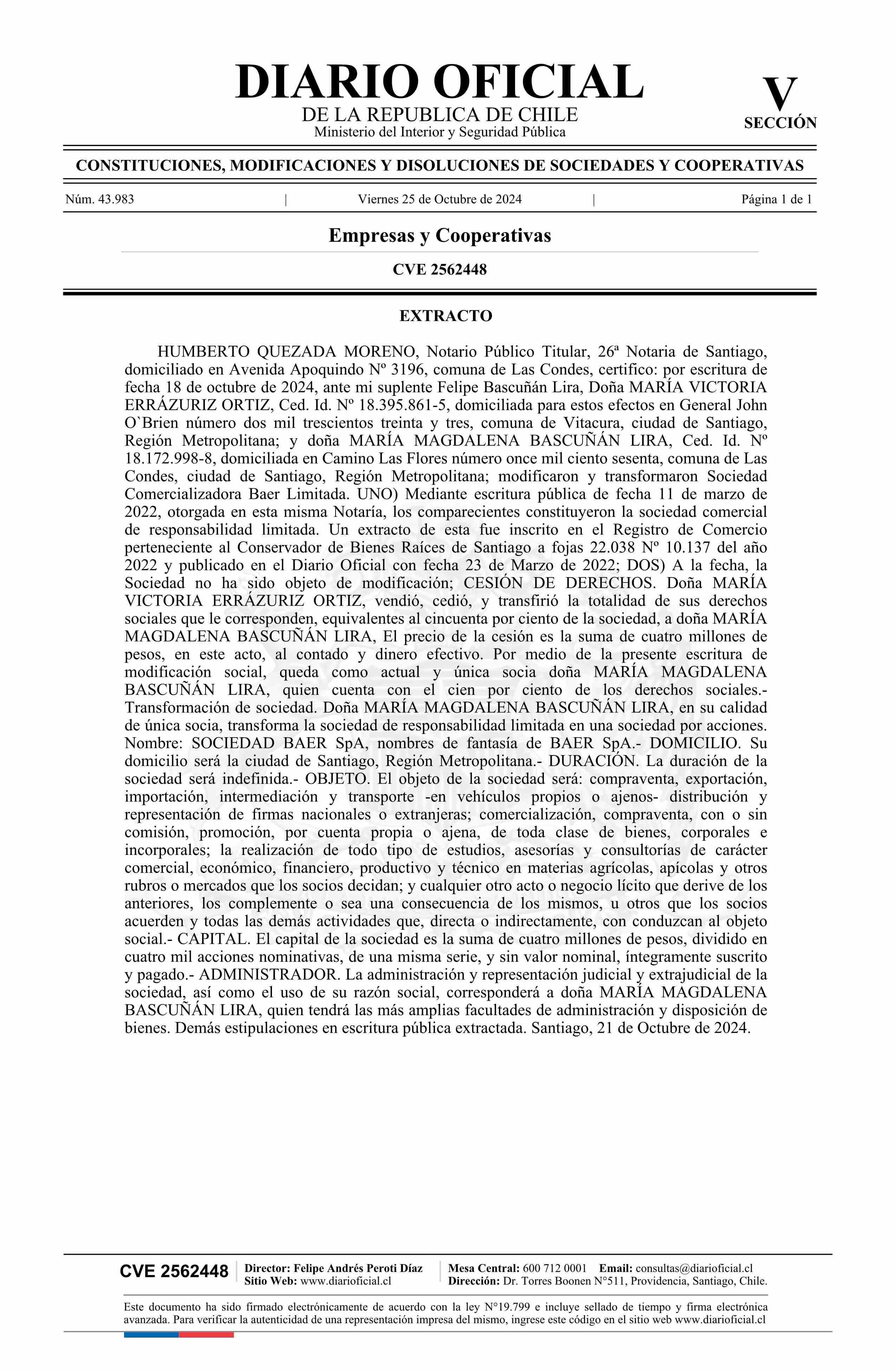 Sociedad Comercializadora Baer Limitada 77.554.406-6* 25-10-2024 Diario Oficial Edición Electrónica |