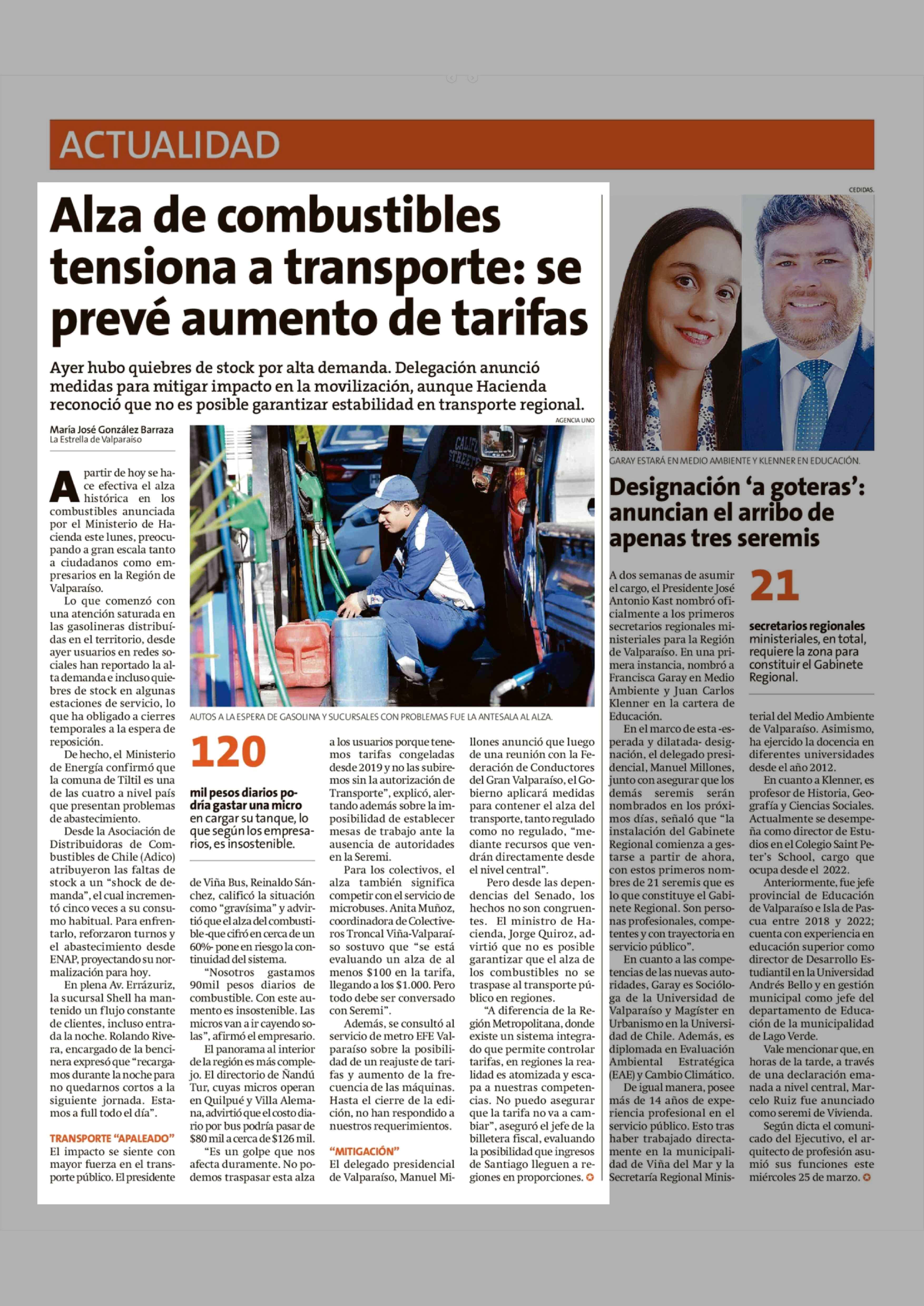 Alza de combustibles tensiona a transporte: se prevé aumento de tarifas 26-03-2026 La Estrella de Valparaíso |