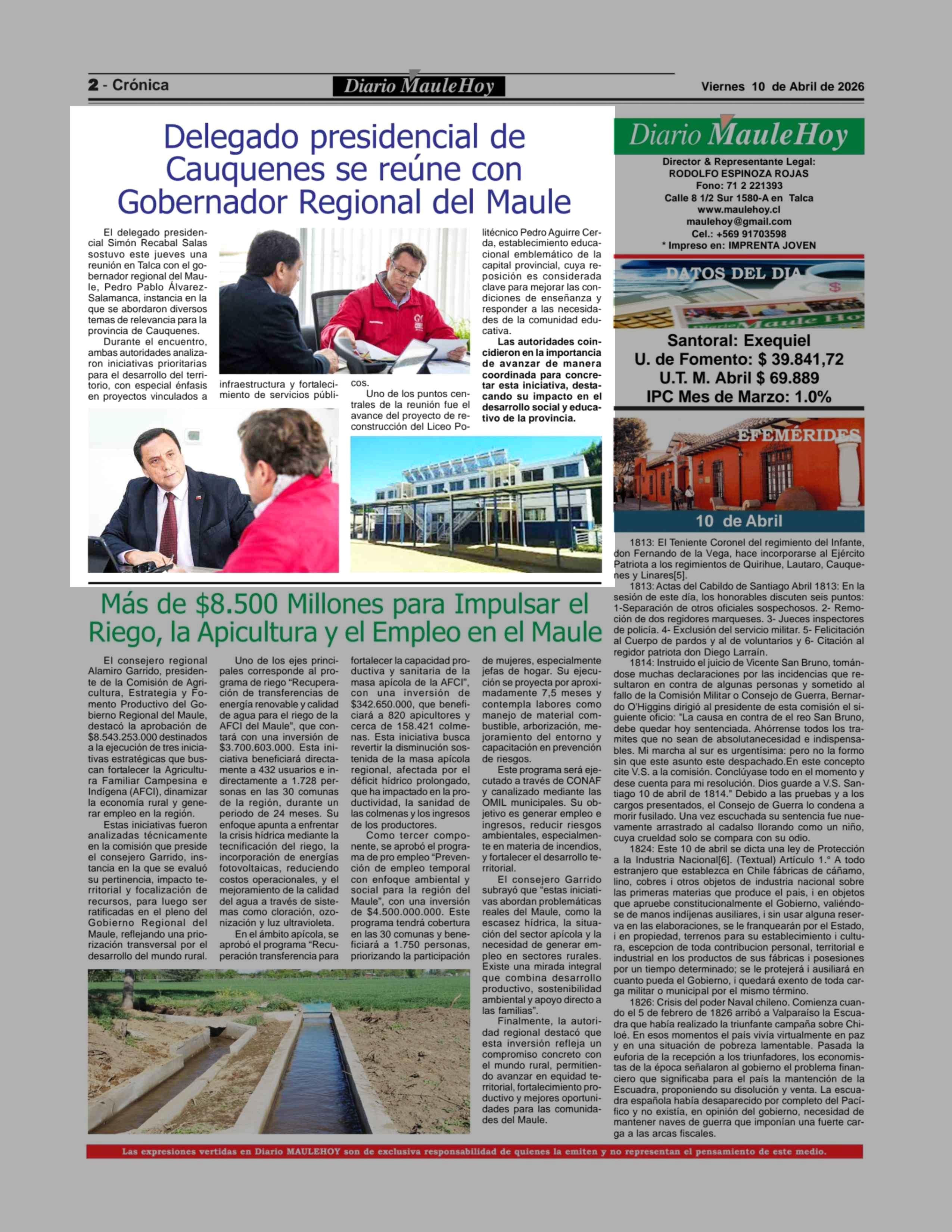 Delegado presidencial de Cauquenes se reúne con Gobernador Regional del Maule 10-04-2026 Maule Hoy |