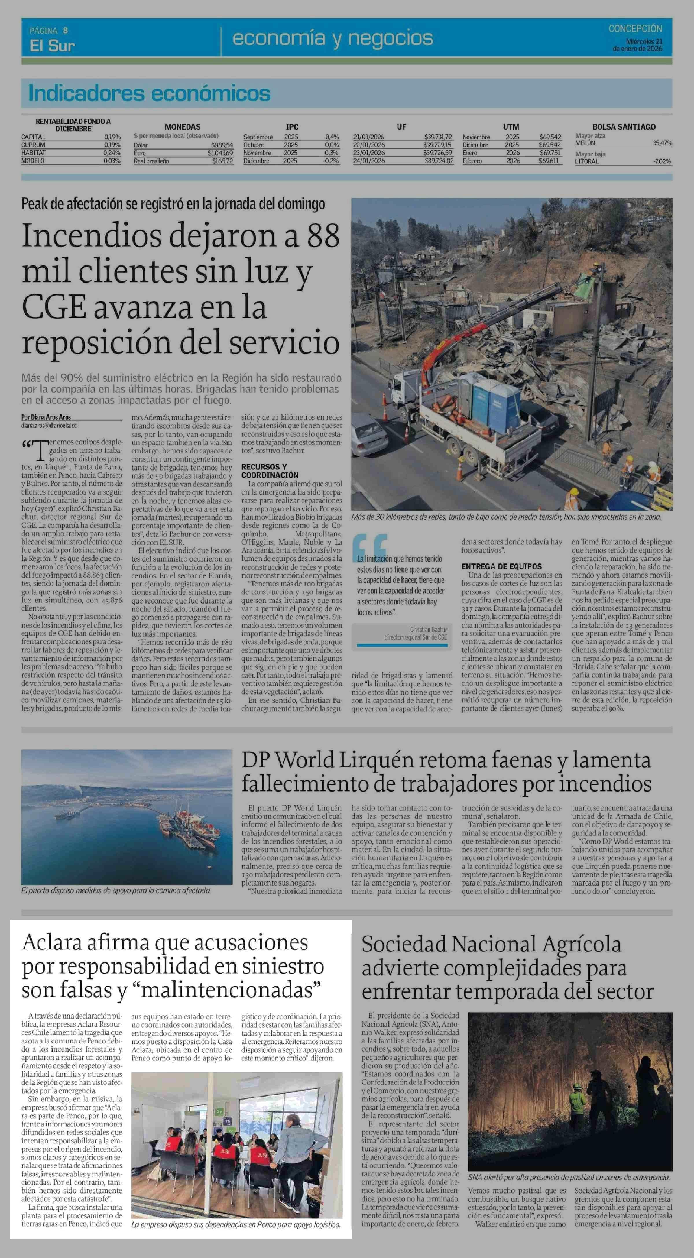 Aclara afirma que acusaciones por responsabilidad en siniestro son falsas y "malintencionadas" 21-01-2026 El Sur |