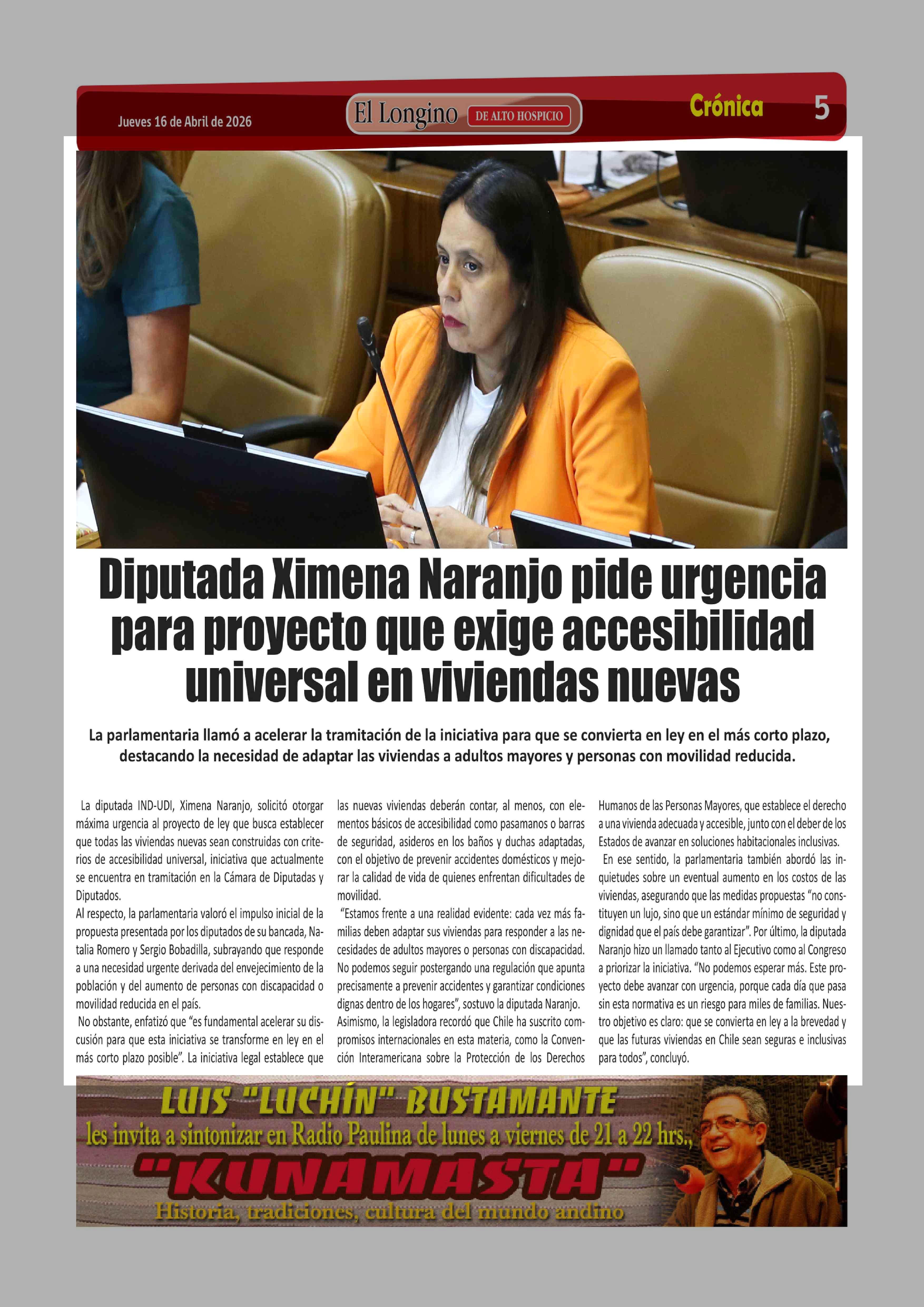 Diputada Ximena Naranjo pide urgencia para proyecto que exige accesibilidad universal en viviendas nuevas 16-04-2026 El Longino |