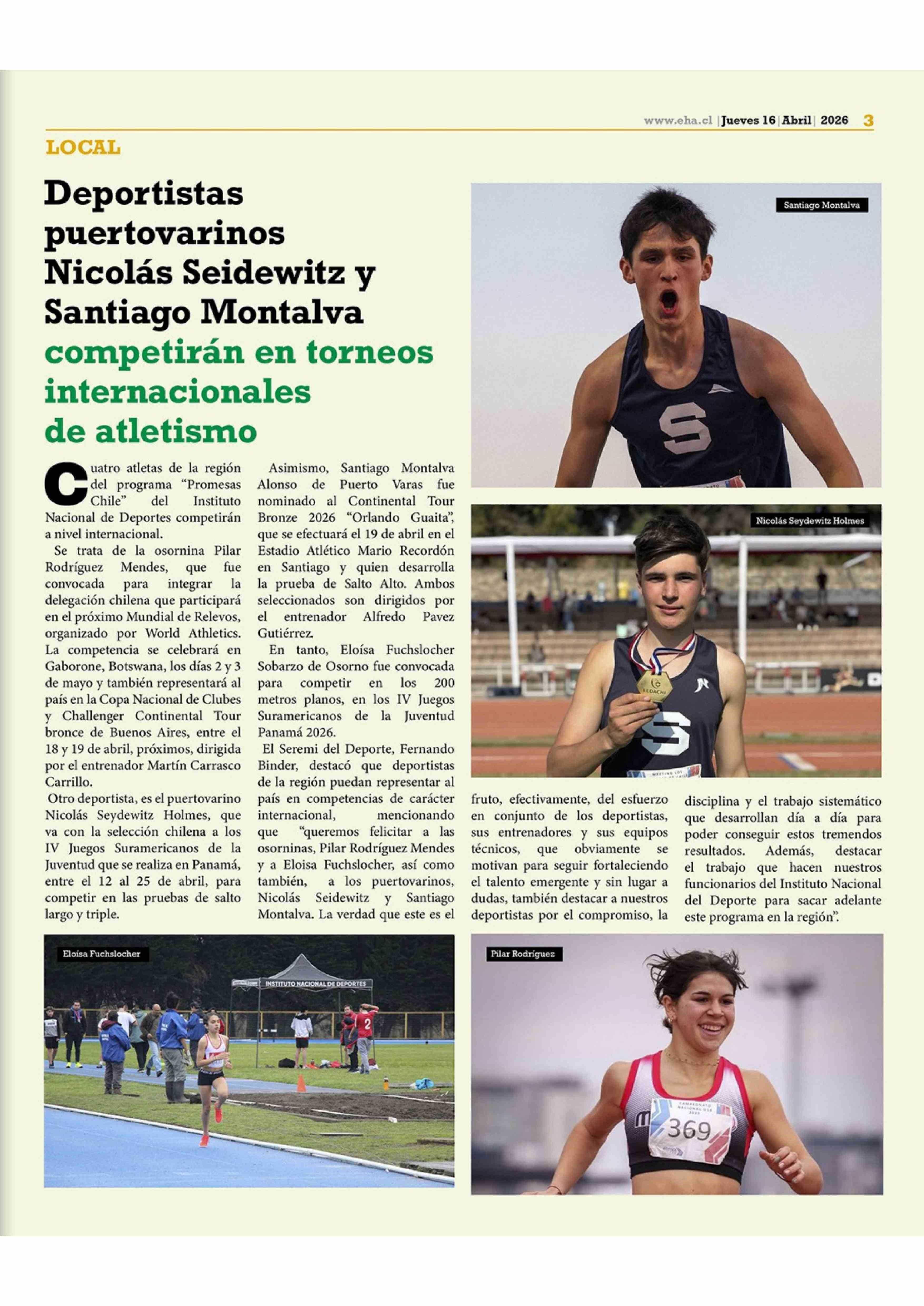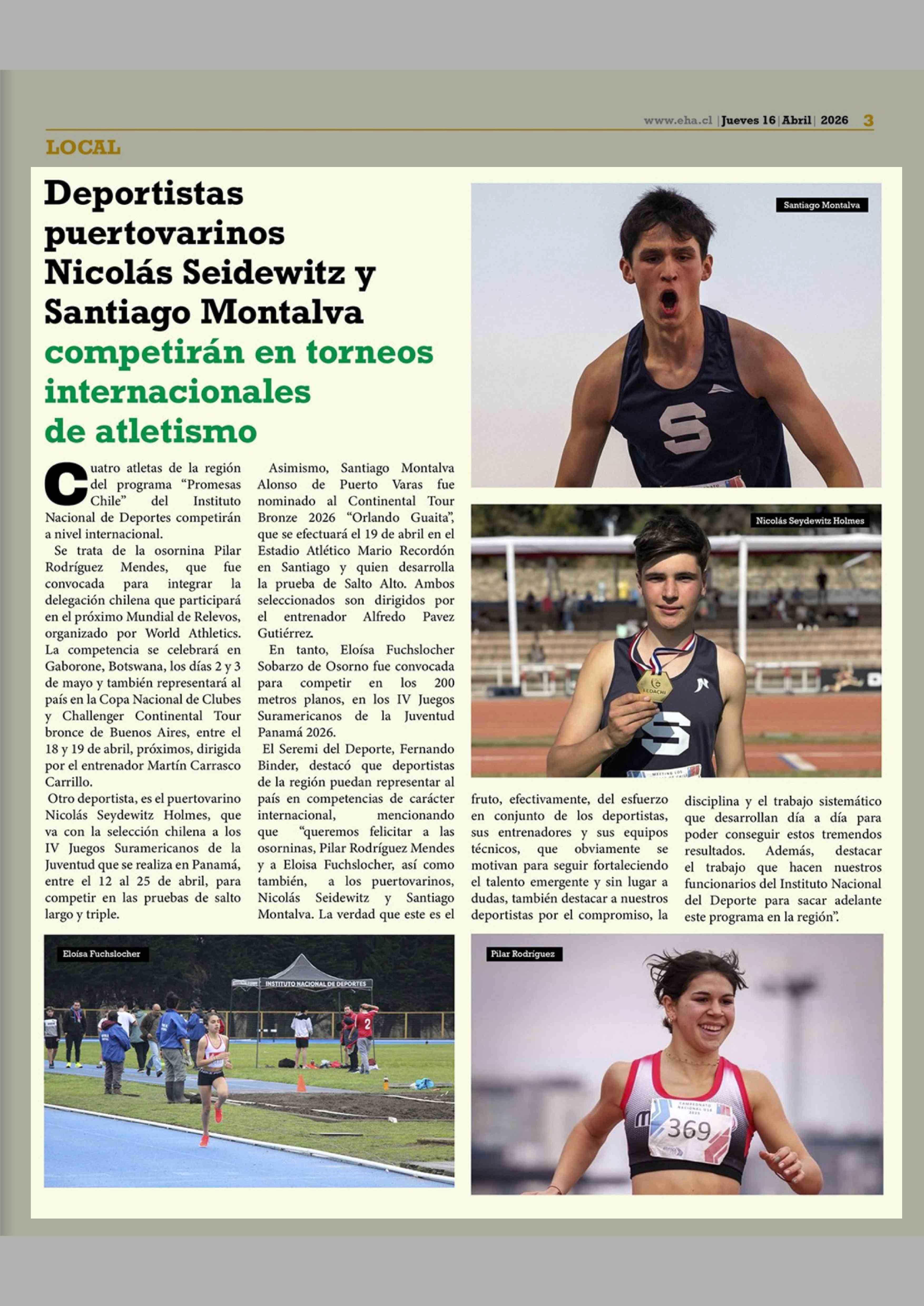 Deportistas puertovarinos Nicolás Seidewitz y Santiago Montalva competirán en torneos internacionales de atletismo 16-04-2026 El Heraldo Austral |
