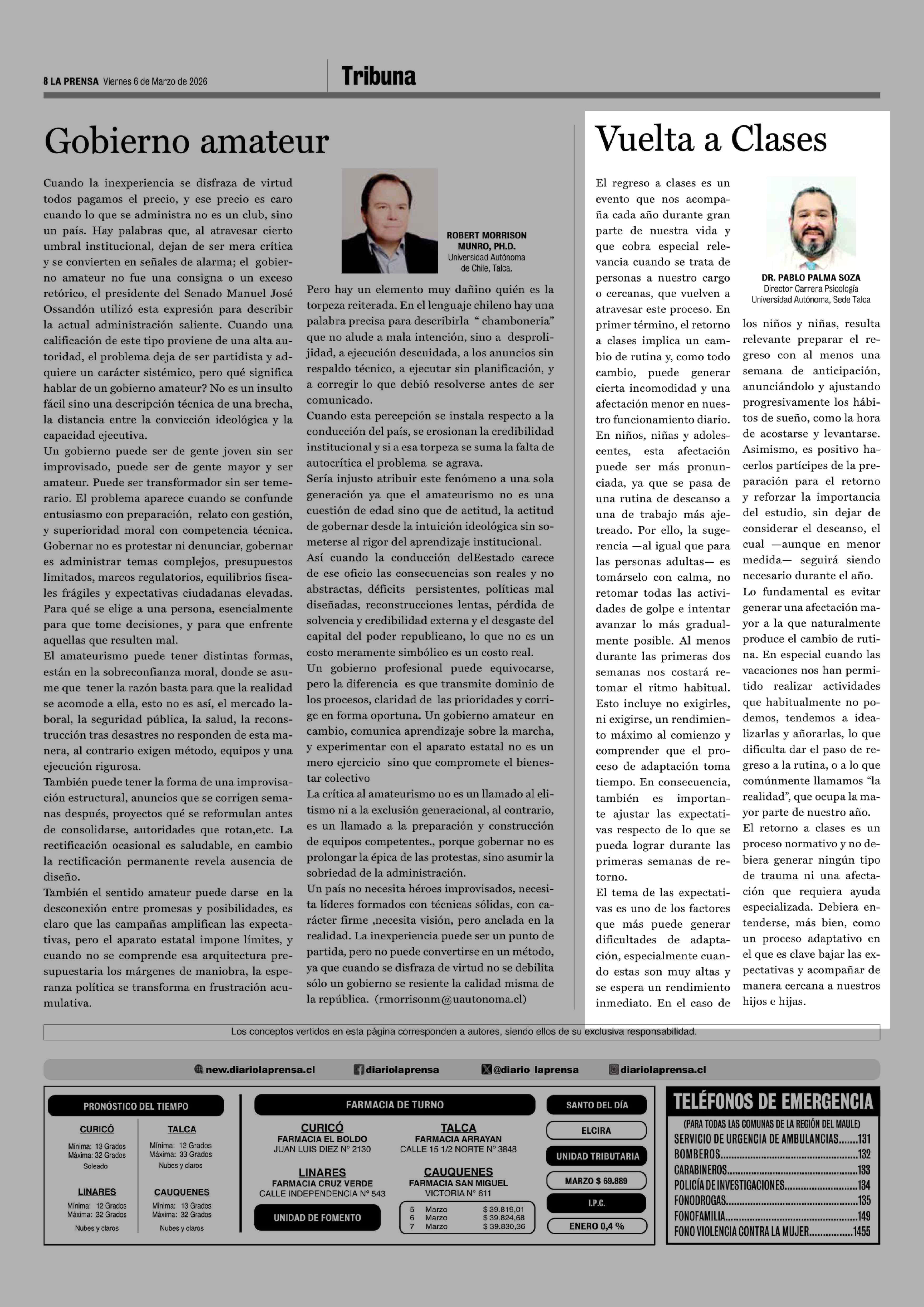 Columnas de Opinión: Vuelta a Clases 06-03-2026 La Prensa de Curicó |