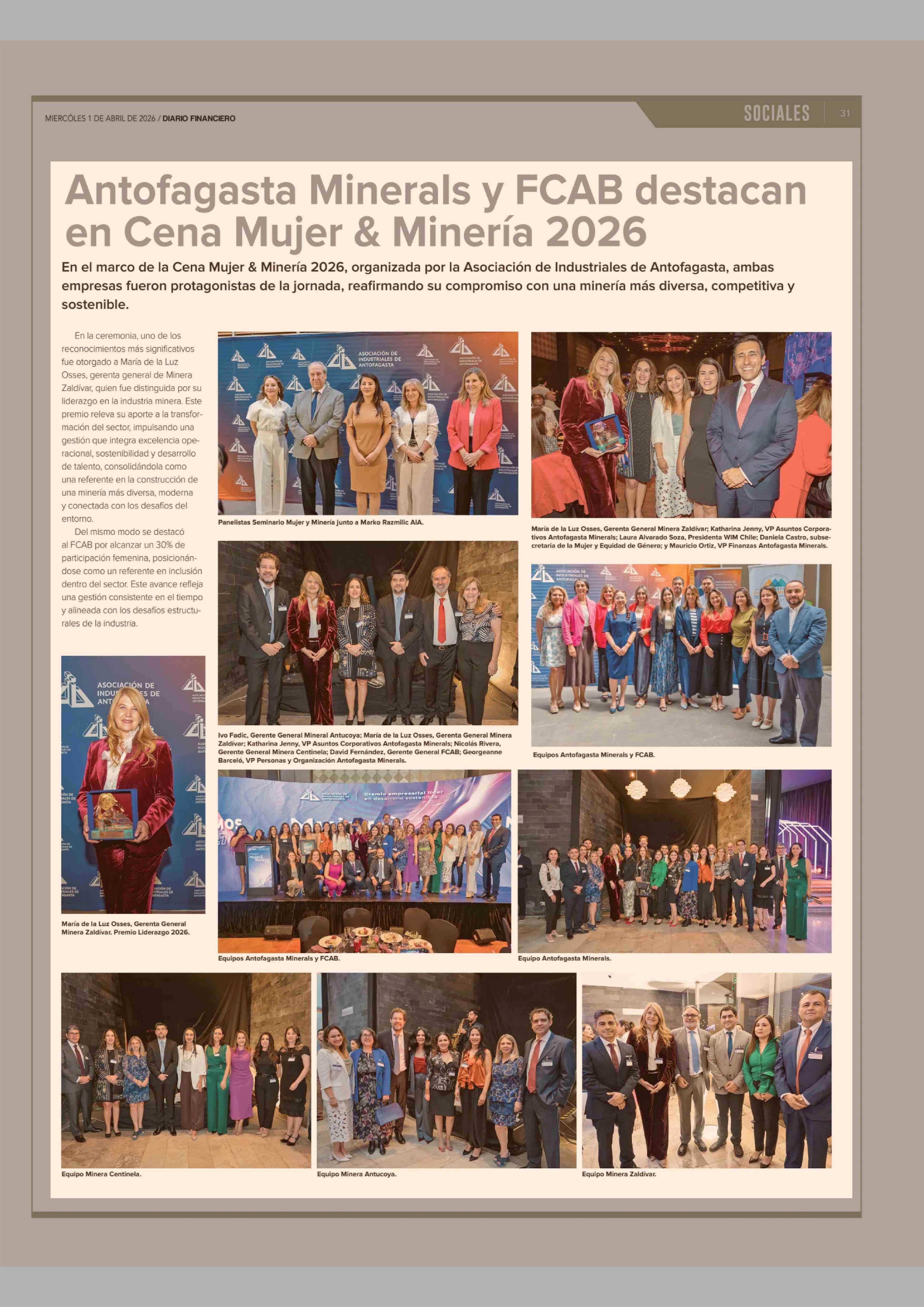 Antofagasta Minerals y FCAB destacan en Cena Mujer & Minería 2026 01-04-2026 Diario Financiero |