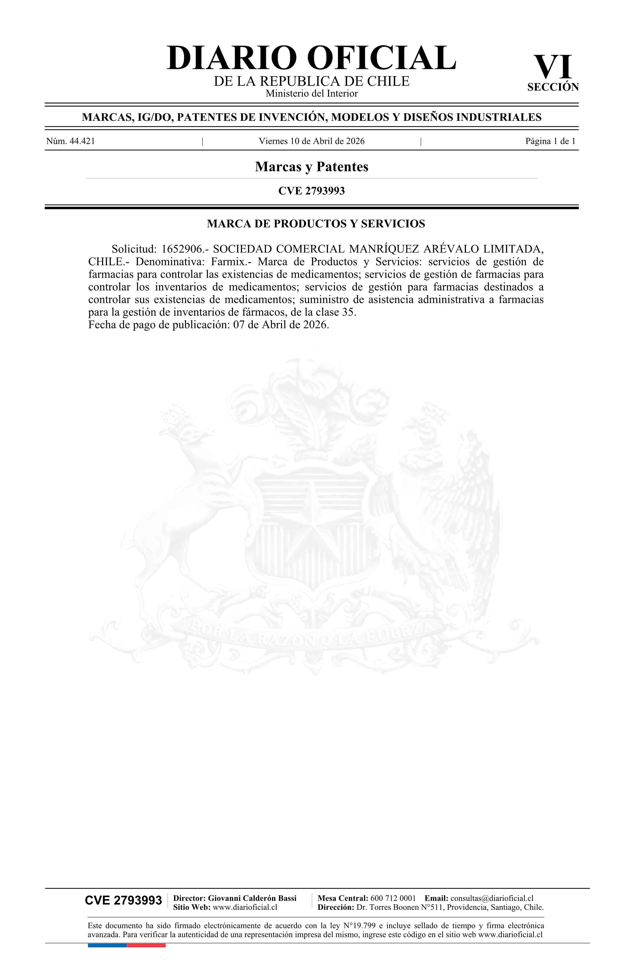 Fuente: Diario Oficial Edición Electrónica (Diario Oficial de Chile - 6 Marcas Y Patentes) Página(s): 105