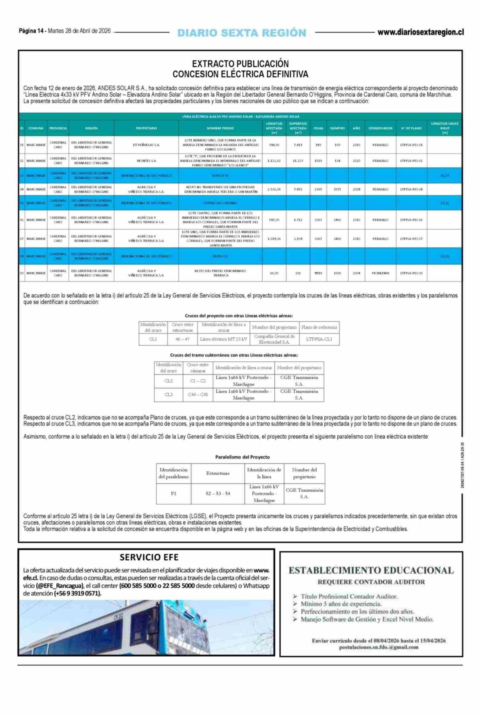 EXTRACTO PUBLICACIÓN CONCESION ELÉCTRICA DEFINITIVA 28-04-2026 Diario VI Región |