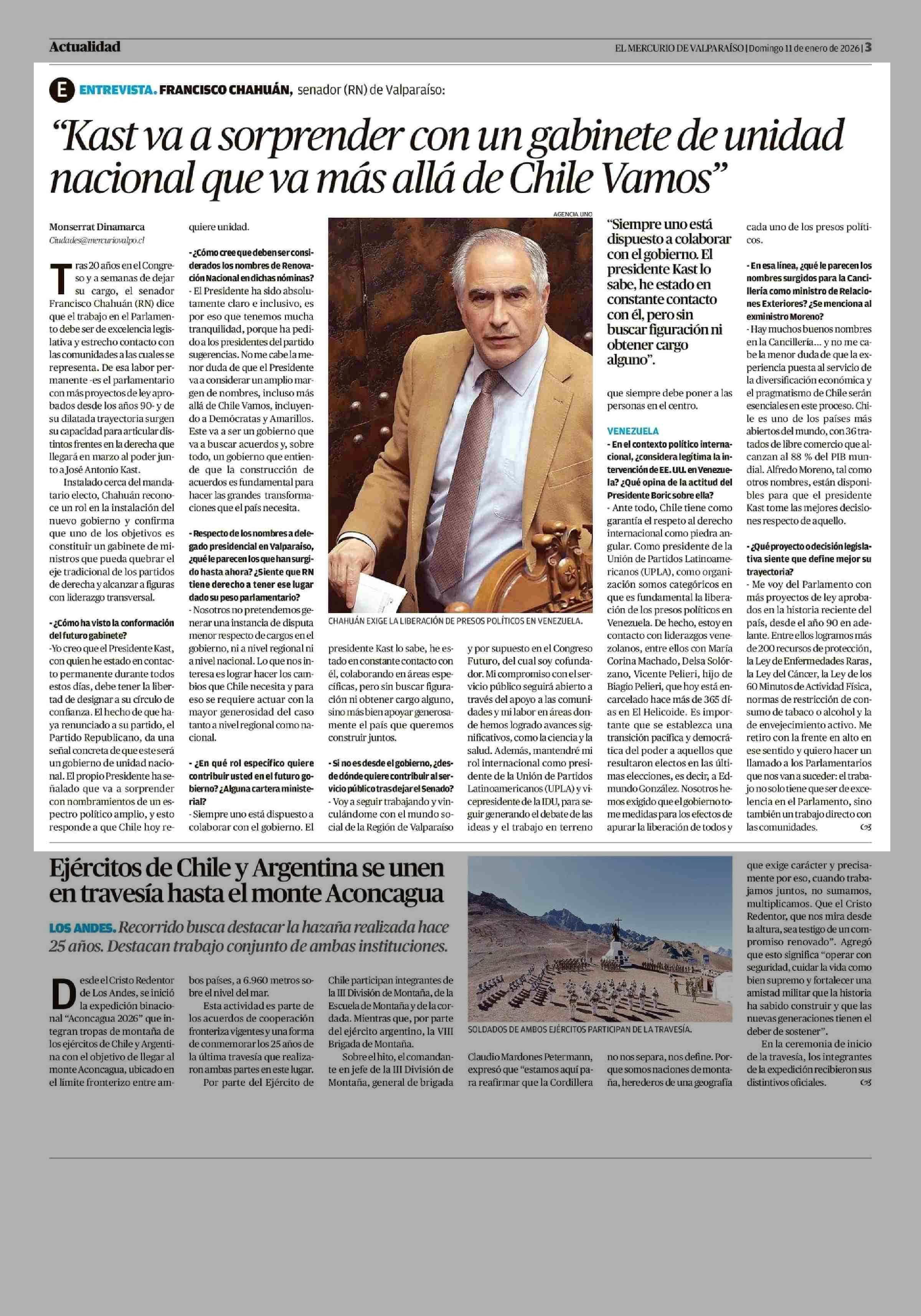 "Kast va a sorprender con un gabinete de unidad nacional que va más allá de Chile Vamos" 11-01-2026 El Mercurio de Valparaíso |