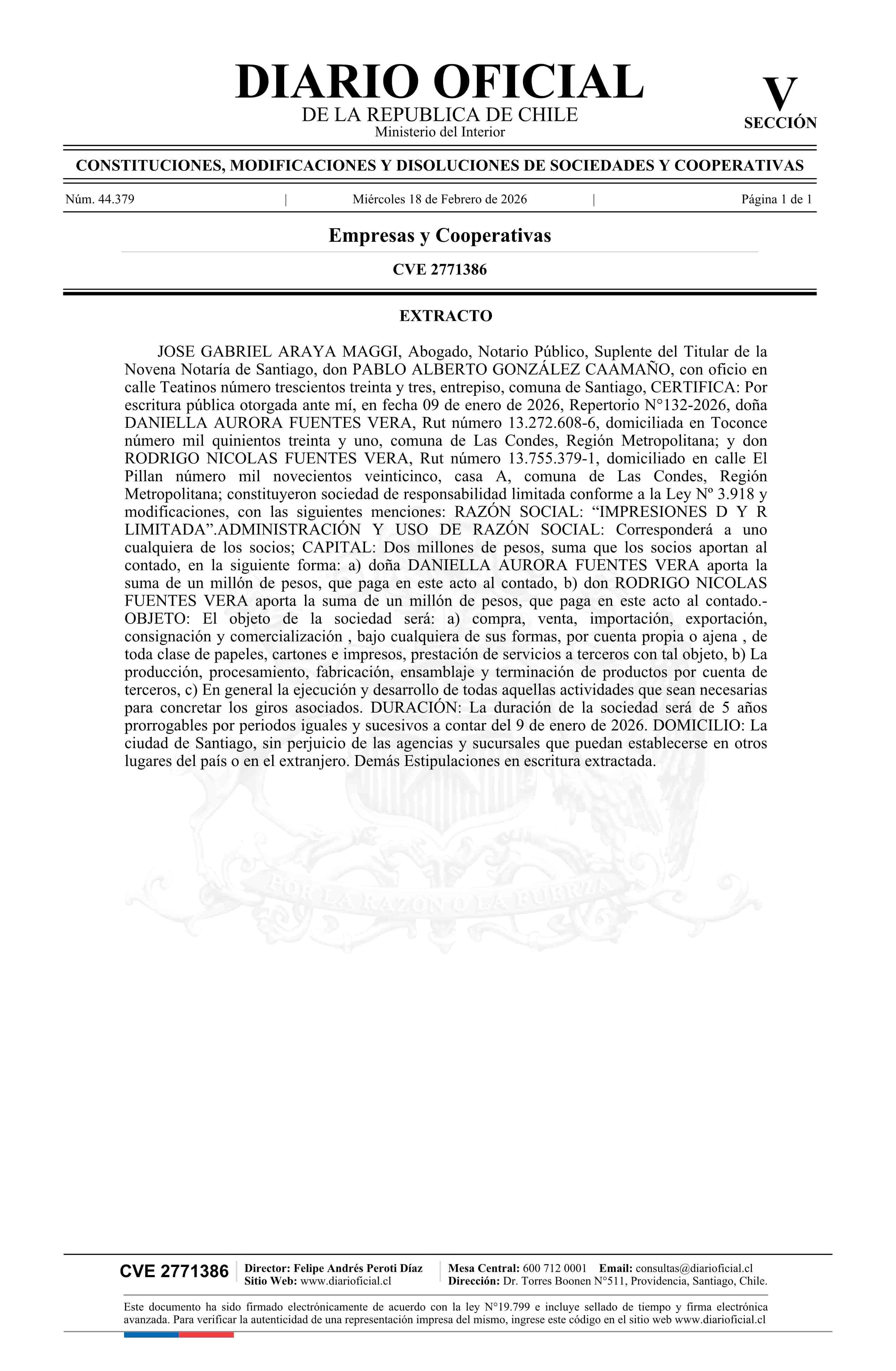 IMPRESIONES D Y R LIMITADA 18-02-2026 Diario Oficial Edición Electrónica |