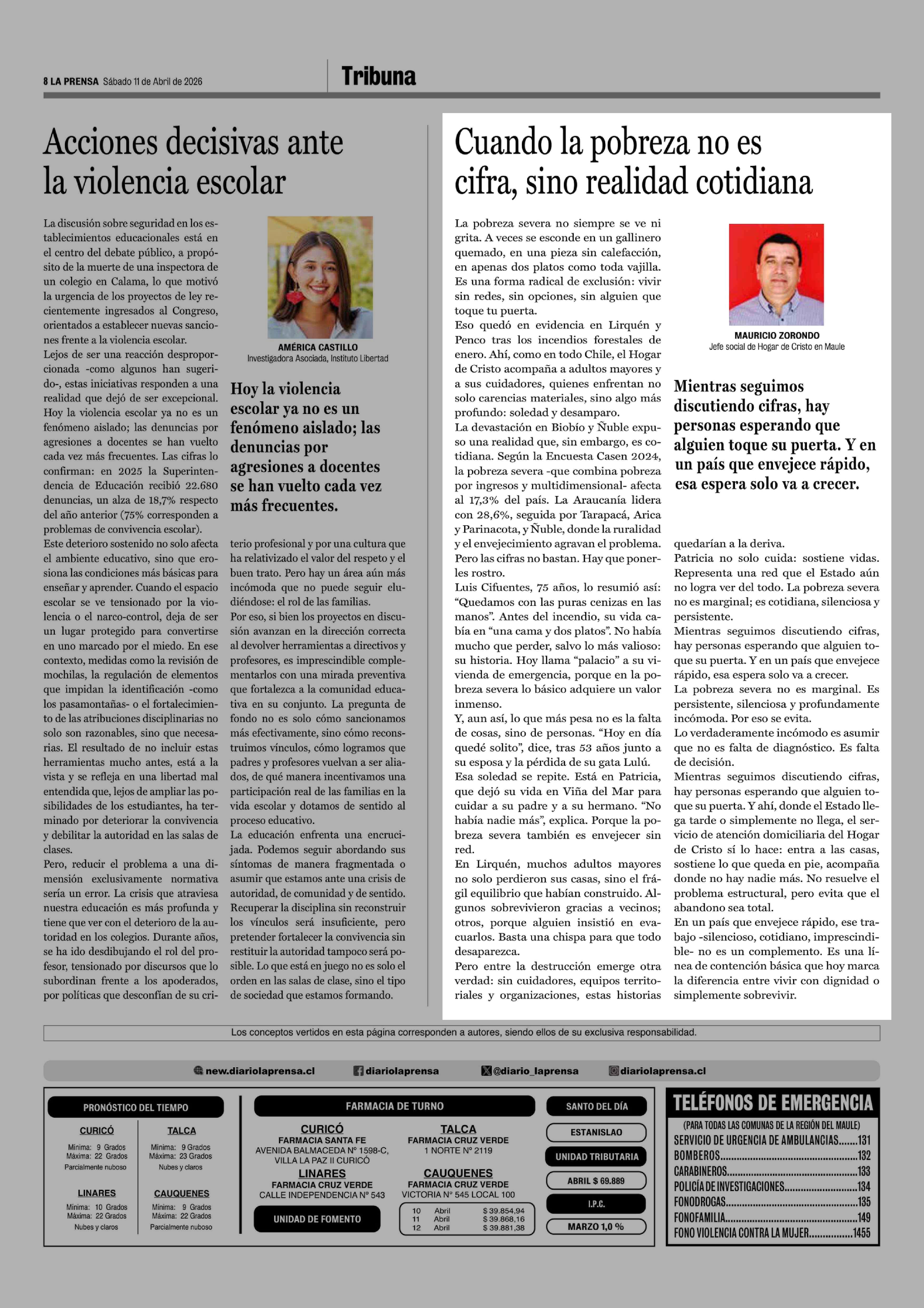 Columnas de Opinión: Cuando la pobreza no es cifra, sino realidad cotidiana 11-04-2026 La Prensa de Curicó |