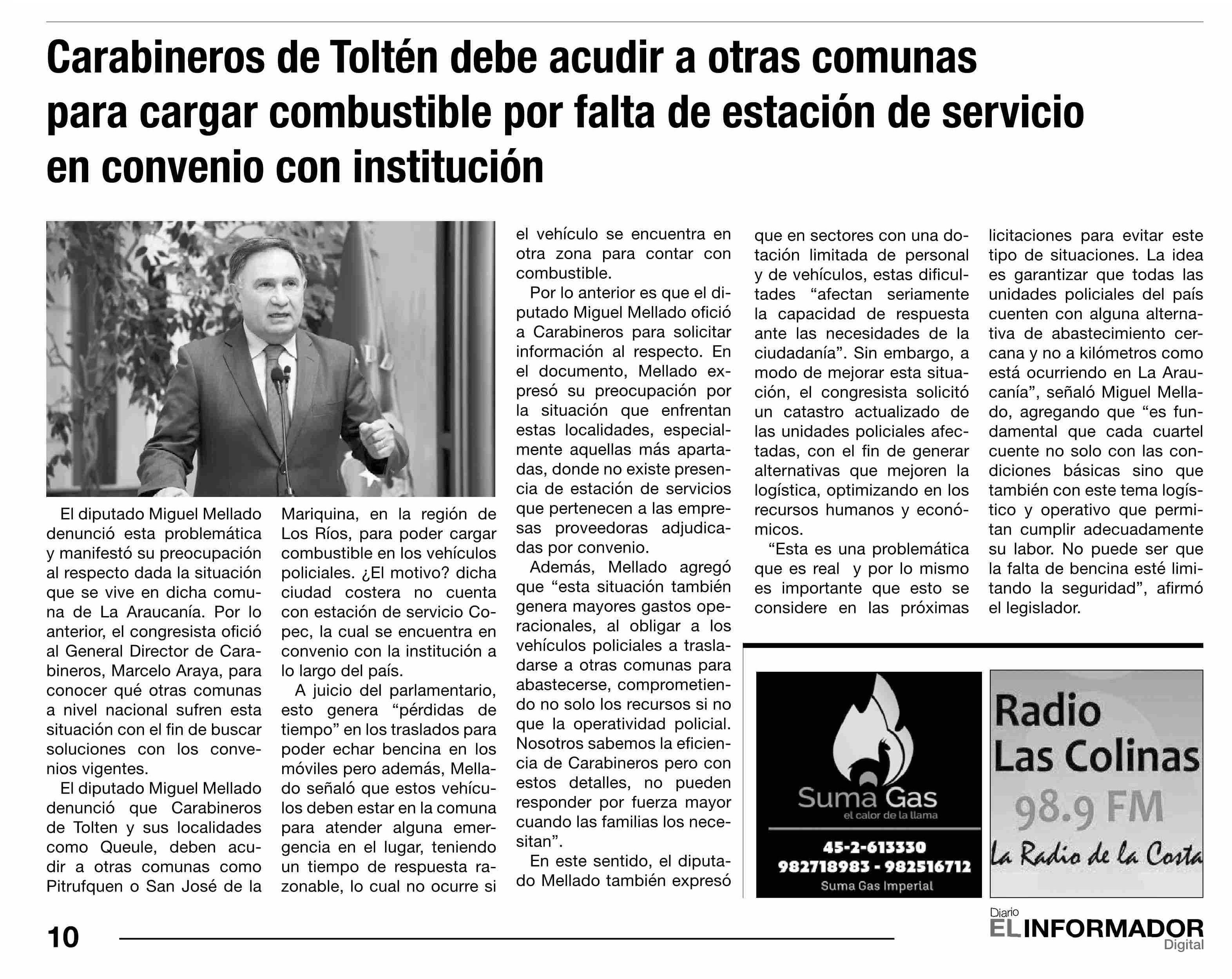 Carabineros de Toltén debe acudir a otras comunas para cargar combustible por falta de estación de servicio en convenio con institución 20-05-2025 El Informador |