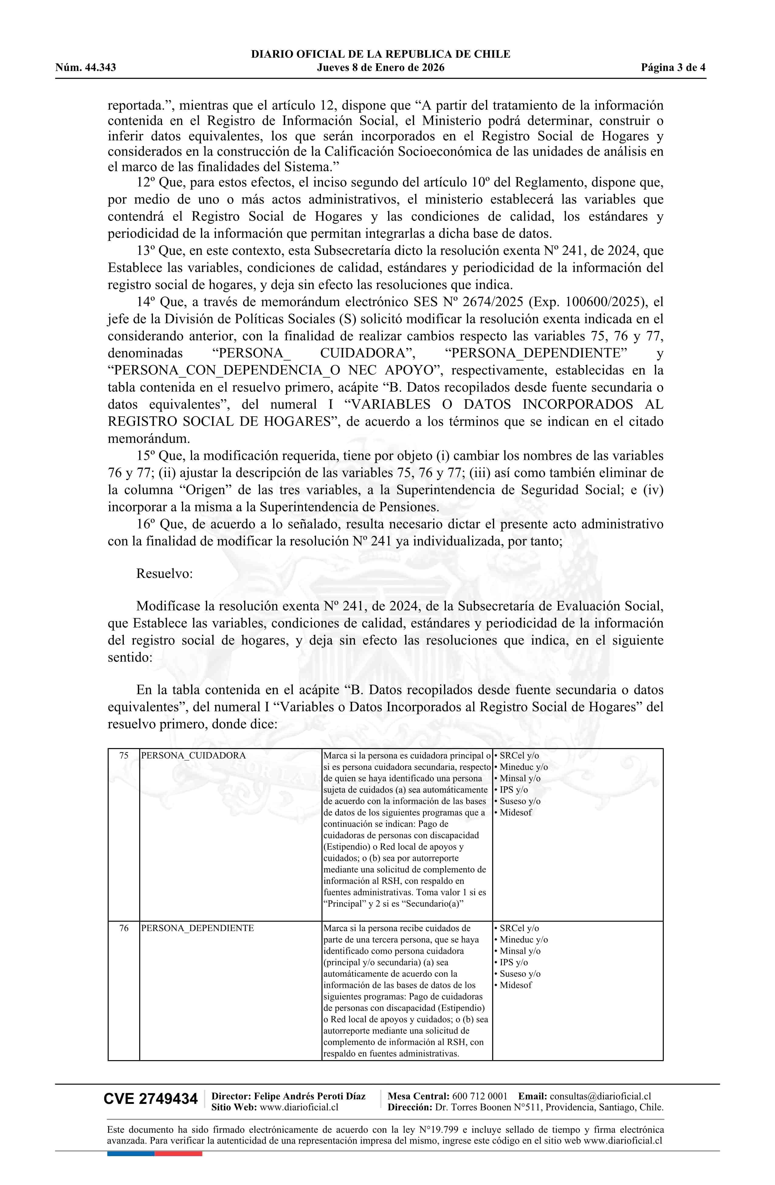 | Título: | Resolución exenta número 245, de 2025.- Modifica resolución Nº 241 exenta, que establece las variables, condiciones de calidad, estándares y periodicidad de la información del Registro Social de Hogares, y deja sin efecto resoluciones que indica |
