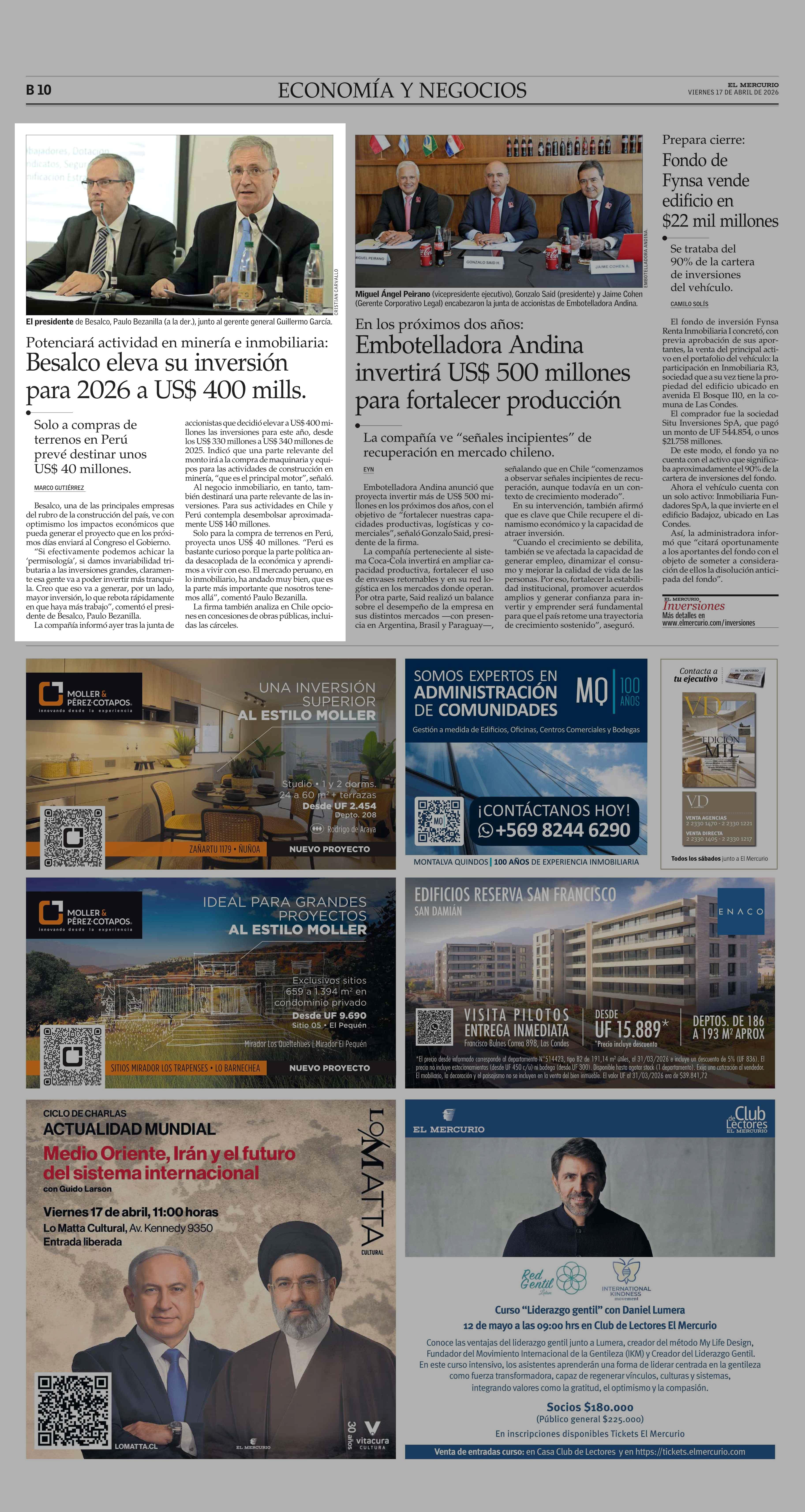Besalco eleva su inversión para 2026 a US$ 400 mills. 17-04-2026 El Mercurio |