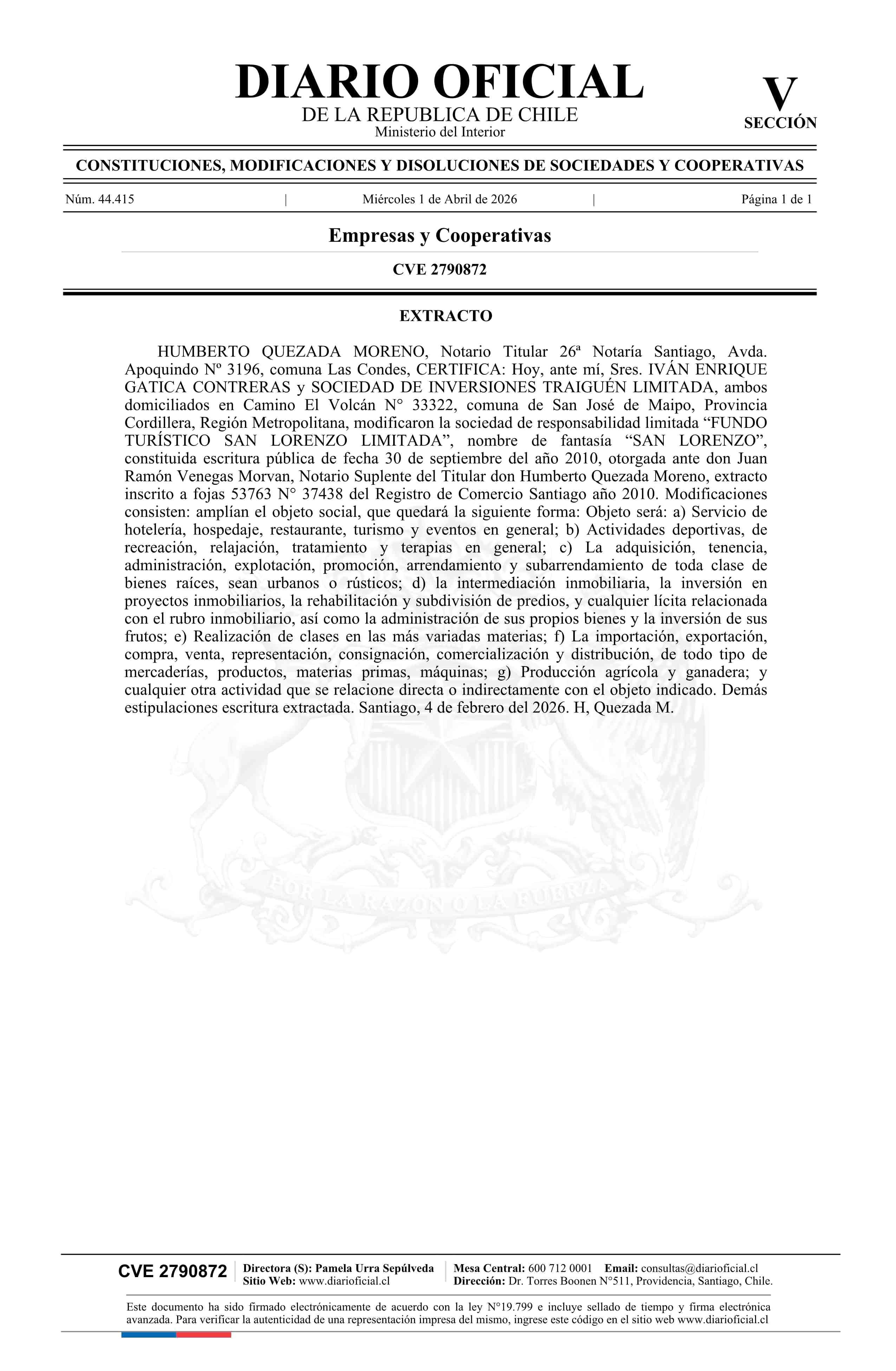 FUNDO TURÍSTICO SAN LORENZO LIMITADA 76.119.109-8 01-04-2026 Diario Oficial Edición Electrónica |