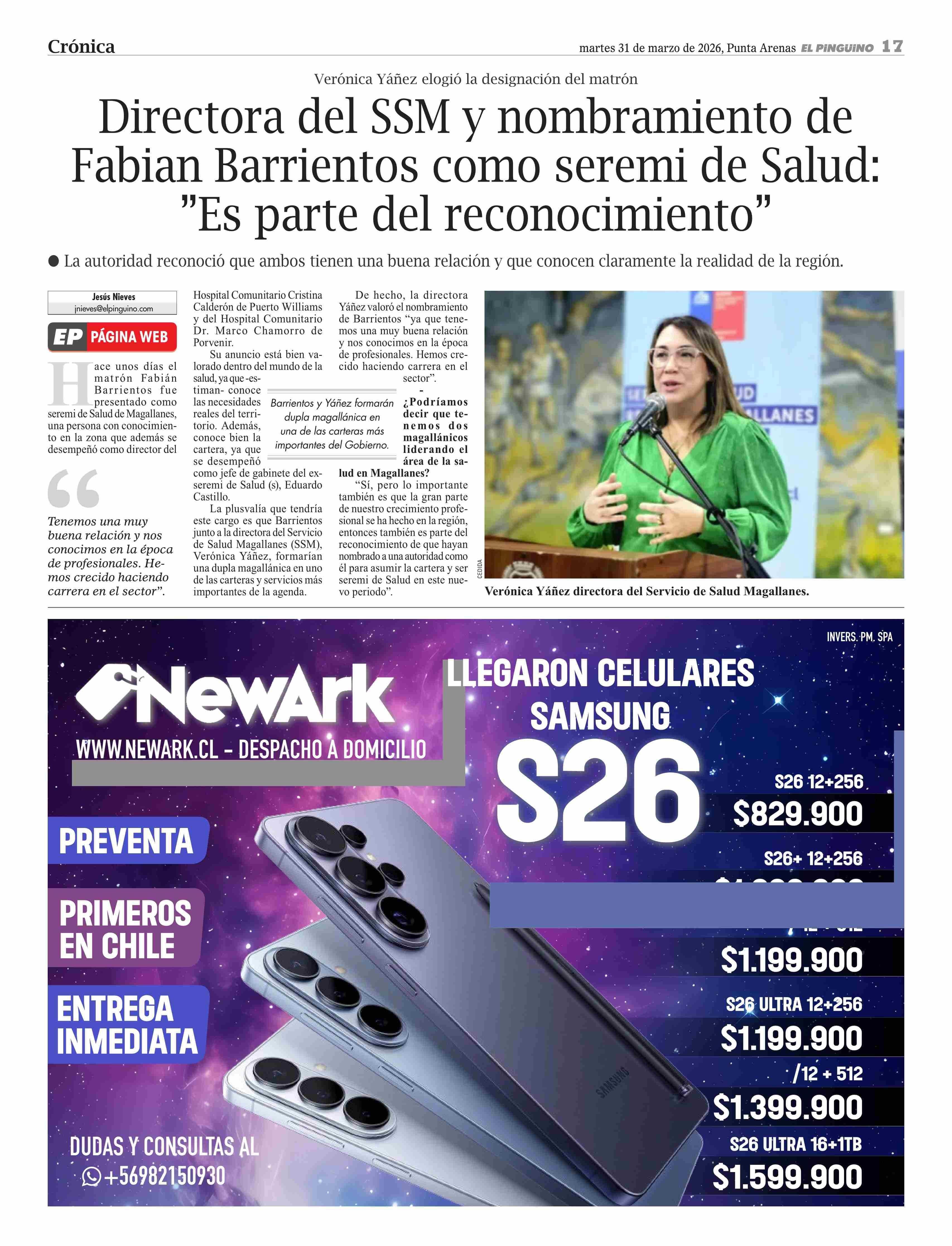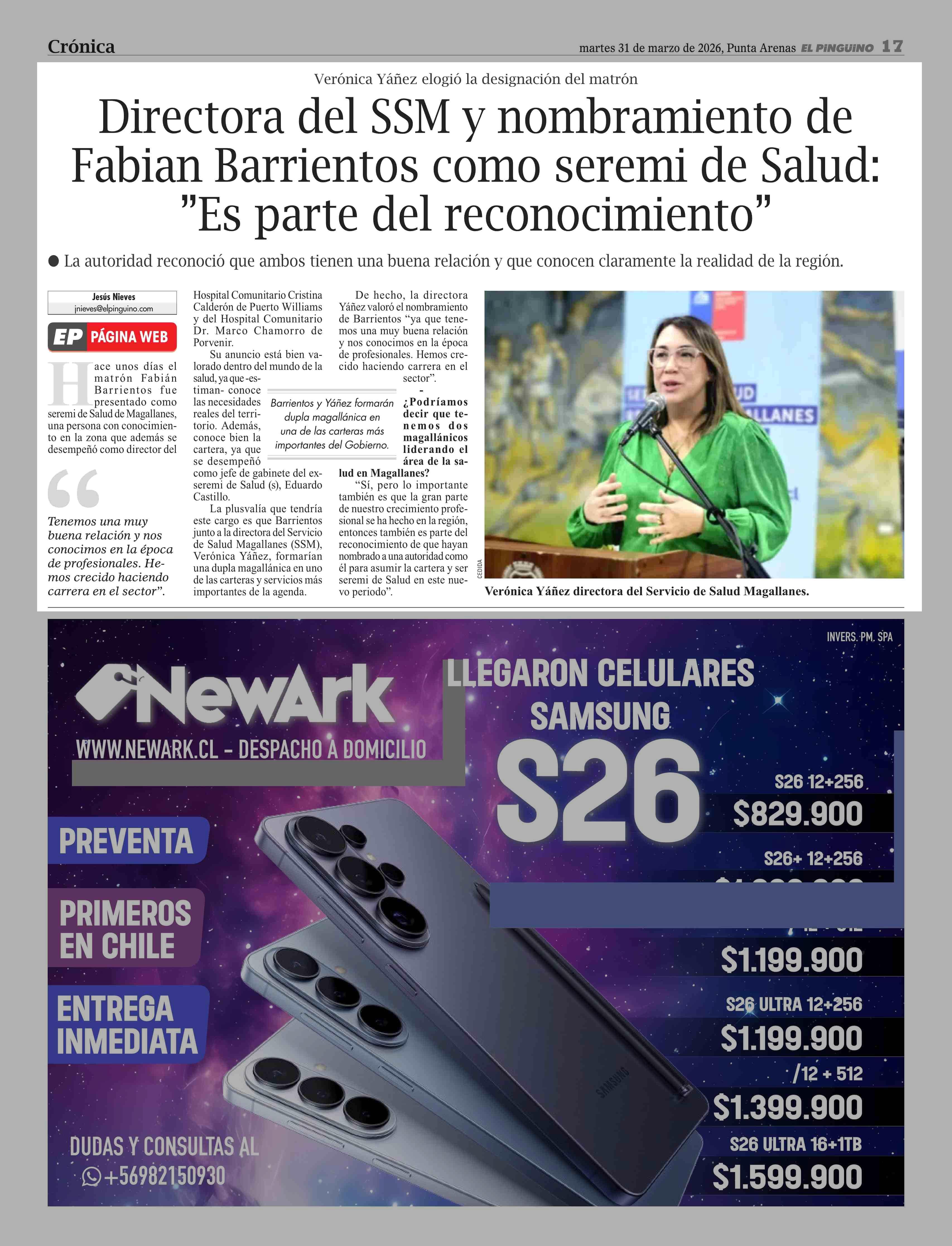 Directora del SSM y nombramiento de Fabian Barrientos como seremi de Salud: ”Es parte del reconocimiento” 31-03-2026 El Pingüino |