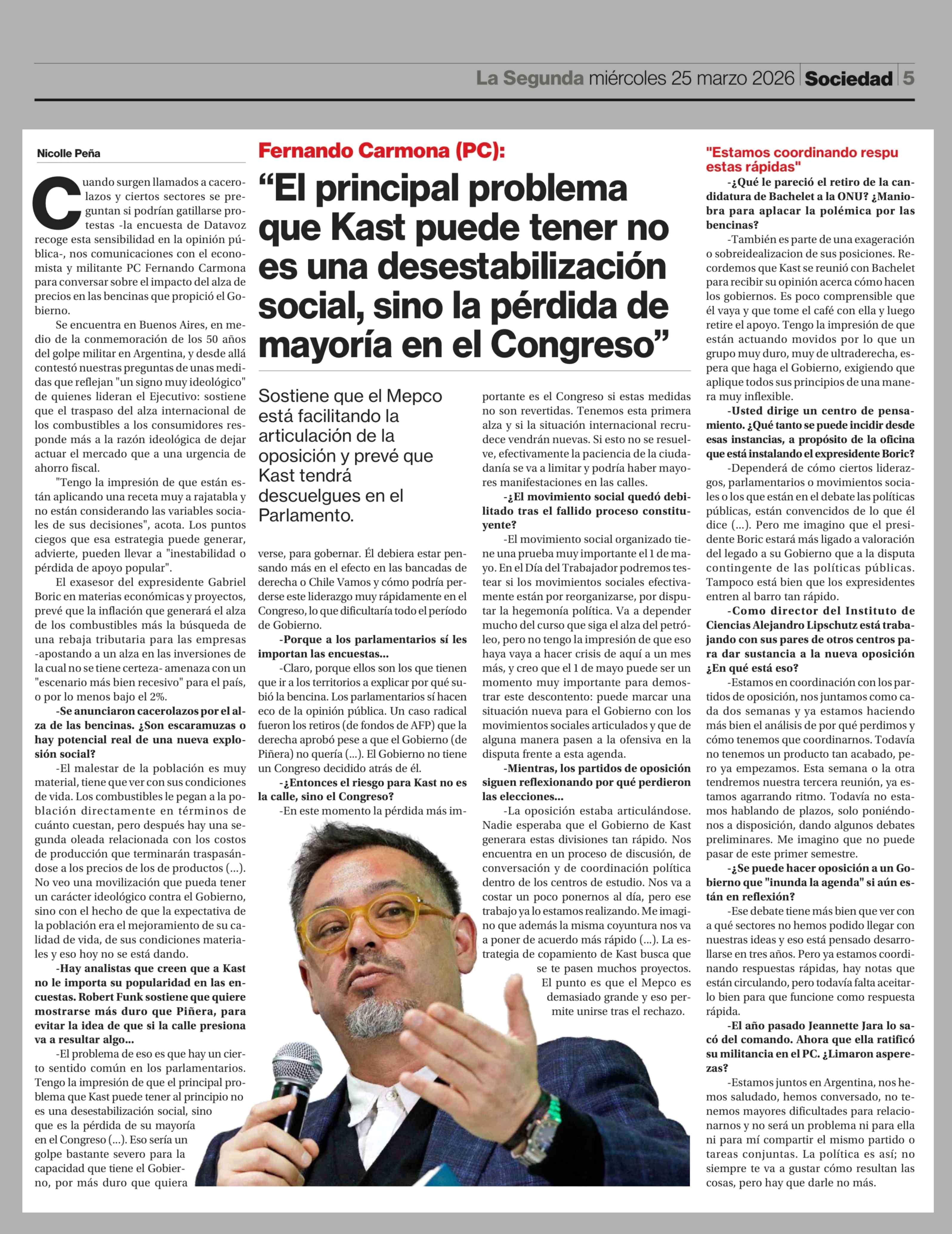 "El principal problema que Kast puede tener no es una desestabilización social, sino la pérdida de mayoría en el Congreso" 25-03-2026 La Segunda |