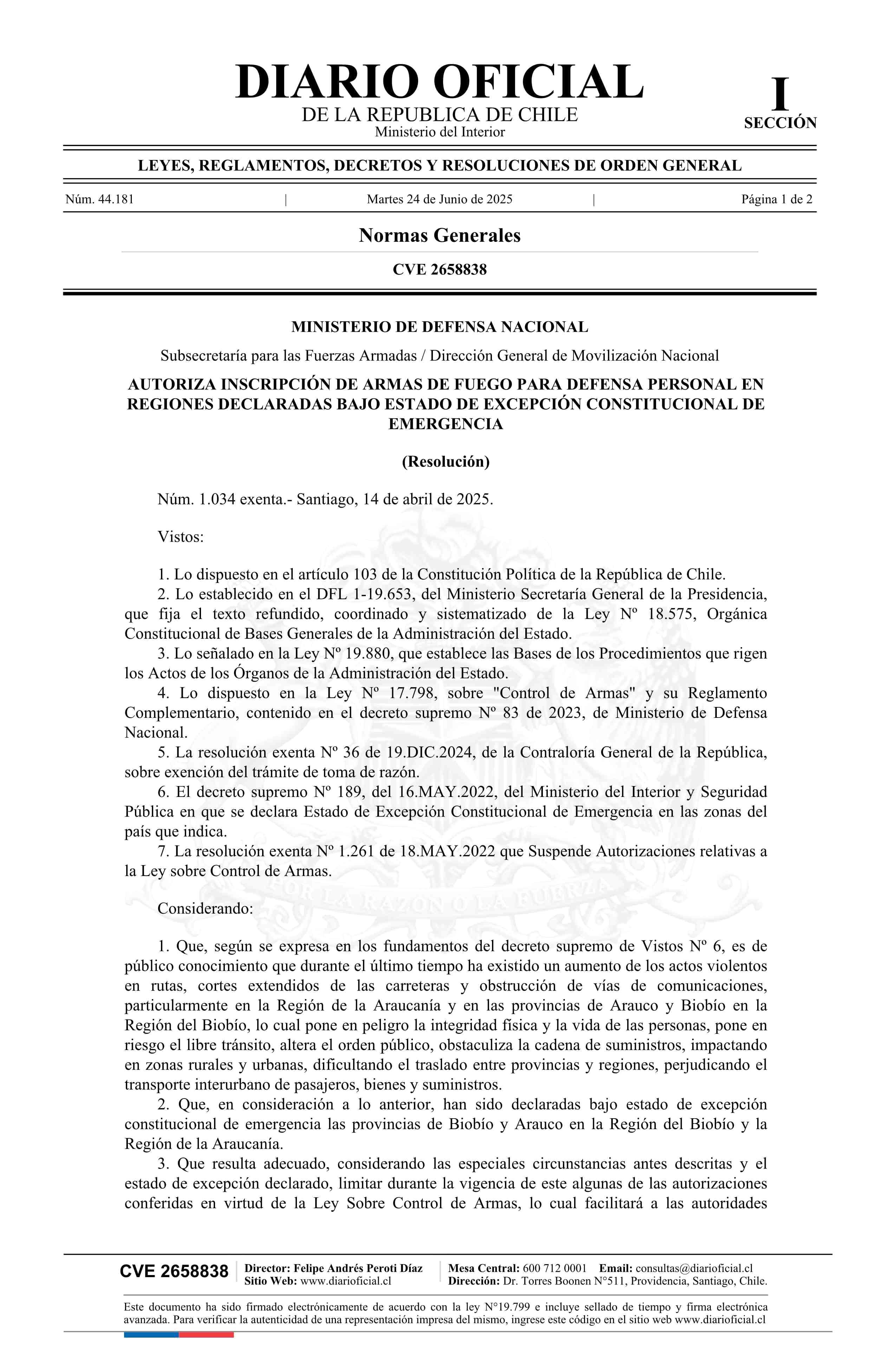 Resolución exenta número 1.034, de 2025.- Autoriza inscripción de armas de fuego para defensa personal en regiones declaradas bajo estado de excepción constitucional de emergencia 24-06-2025 DIARIO OFICIAL CHILE - BOLETÍN OFICIAL DE MINERÍA |