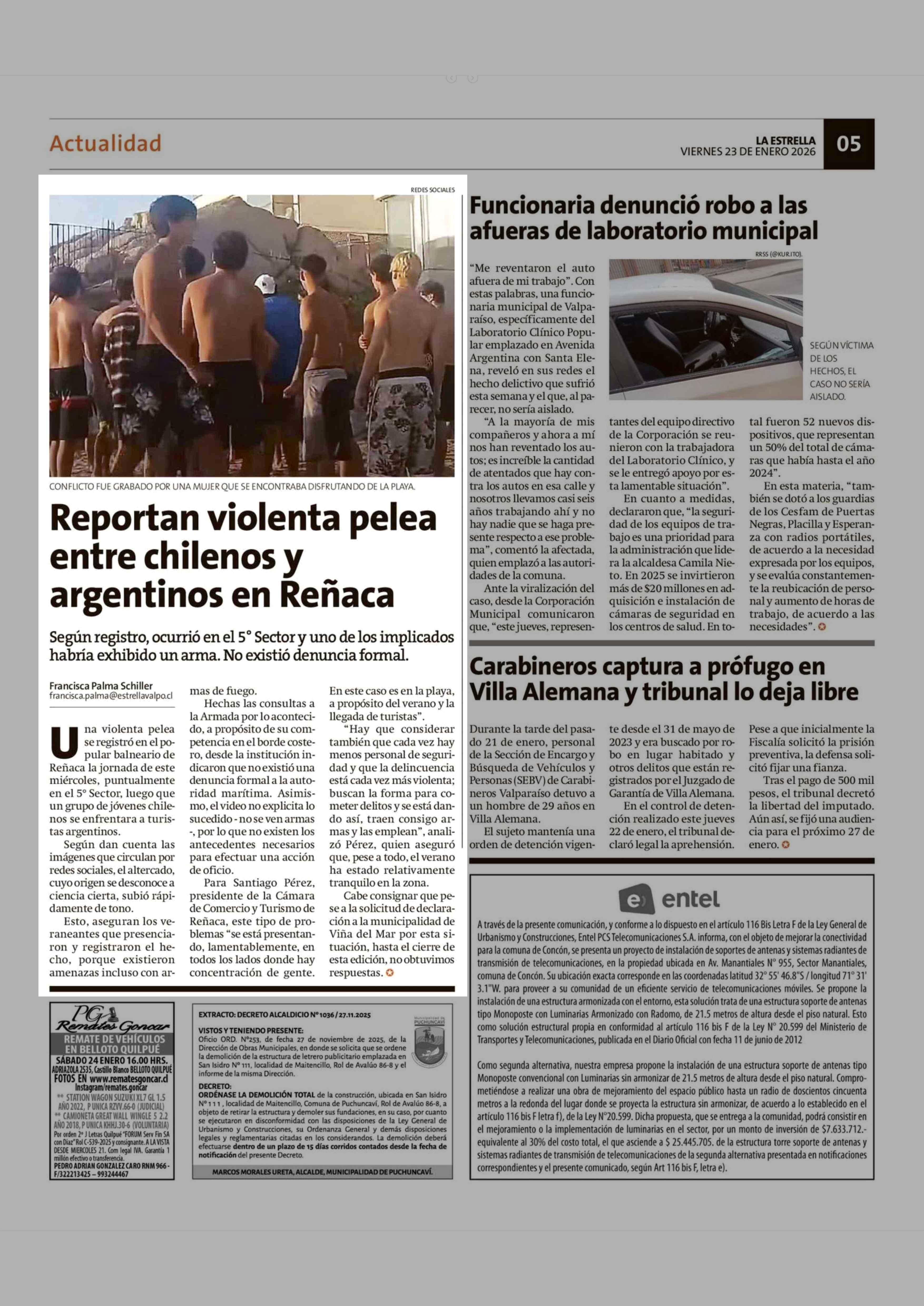 Reportan violenta pelea entre chilenos y argentinos en Reñaca 23-01-2026 La Estrella de Valparaíso |