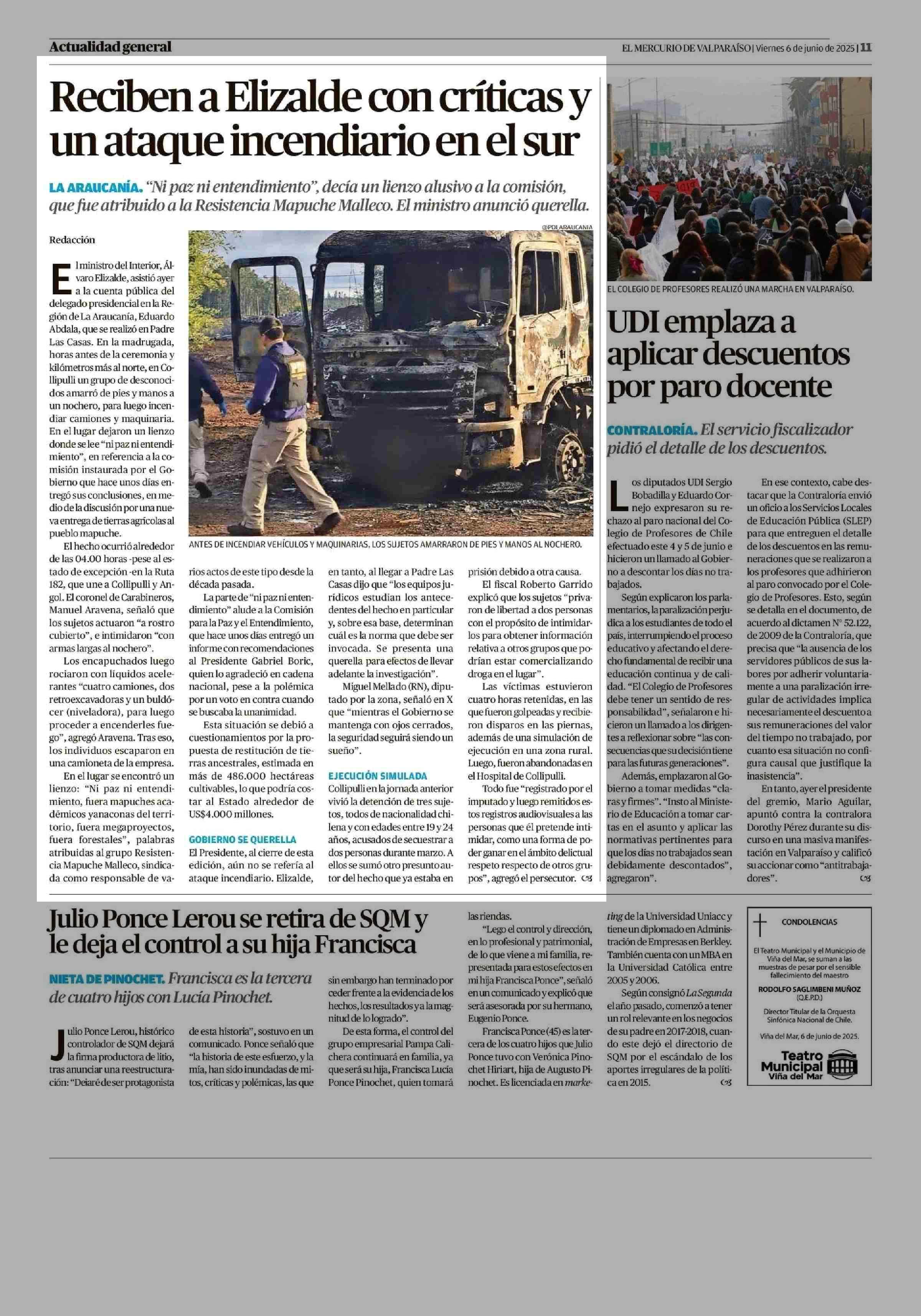 Reciben a Elizalde con críticas y un ataque incendiario en el sur 06-06-2025 El Mercurio de Valparaíso |