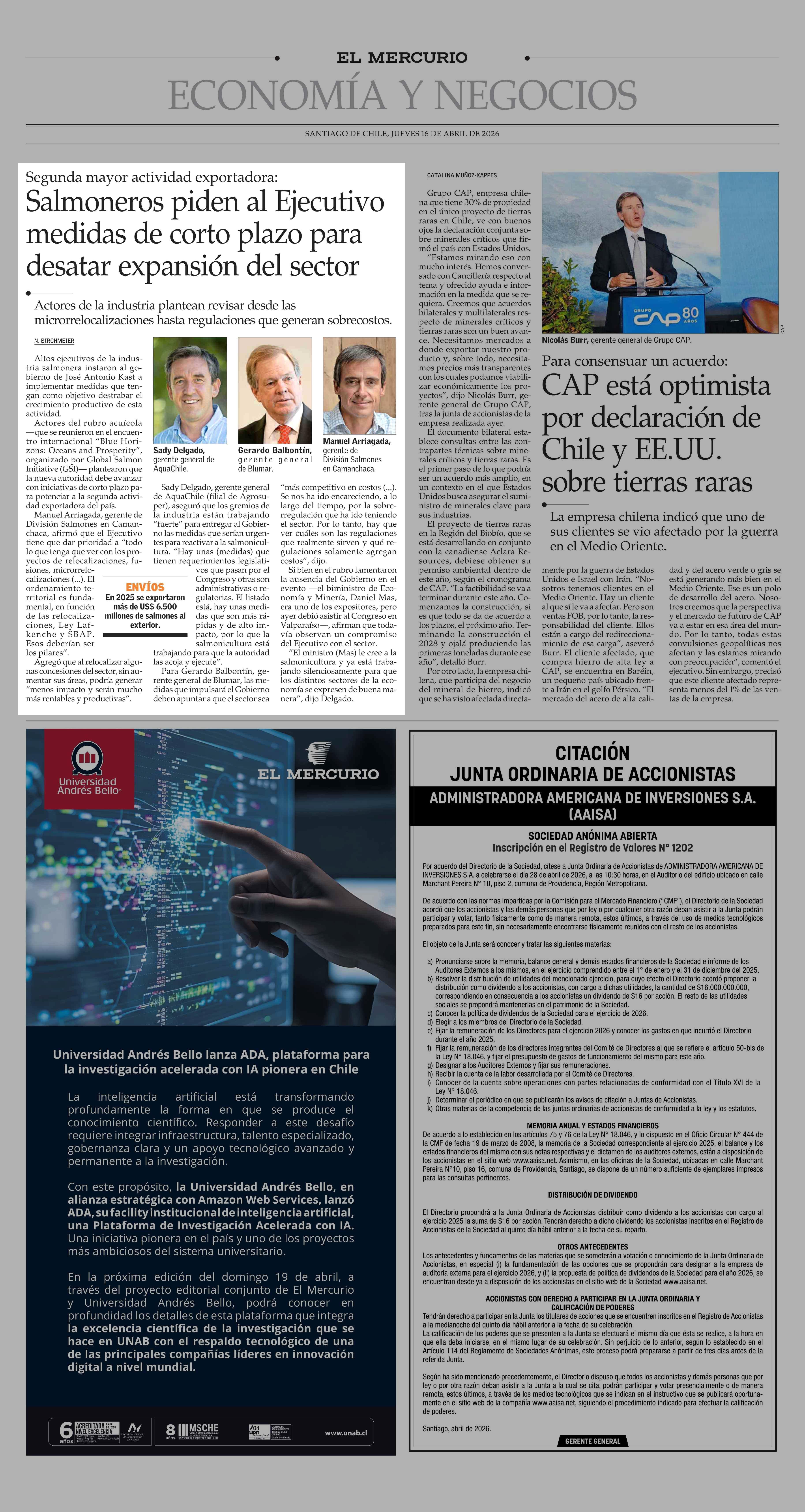 Salmoneros piden al Ejecutivo medidas de corto plazo para desatar expansión del sector 16-04-2026 El Mercurio |