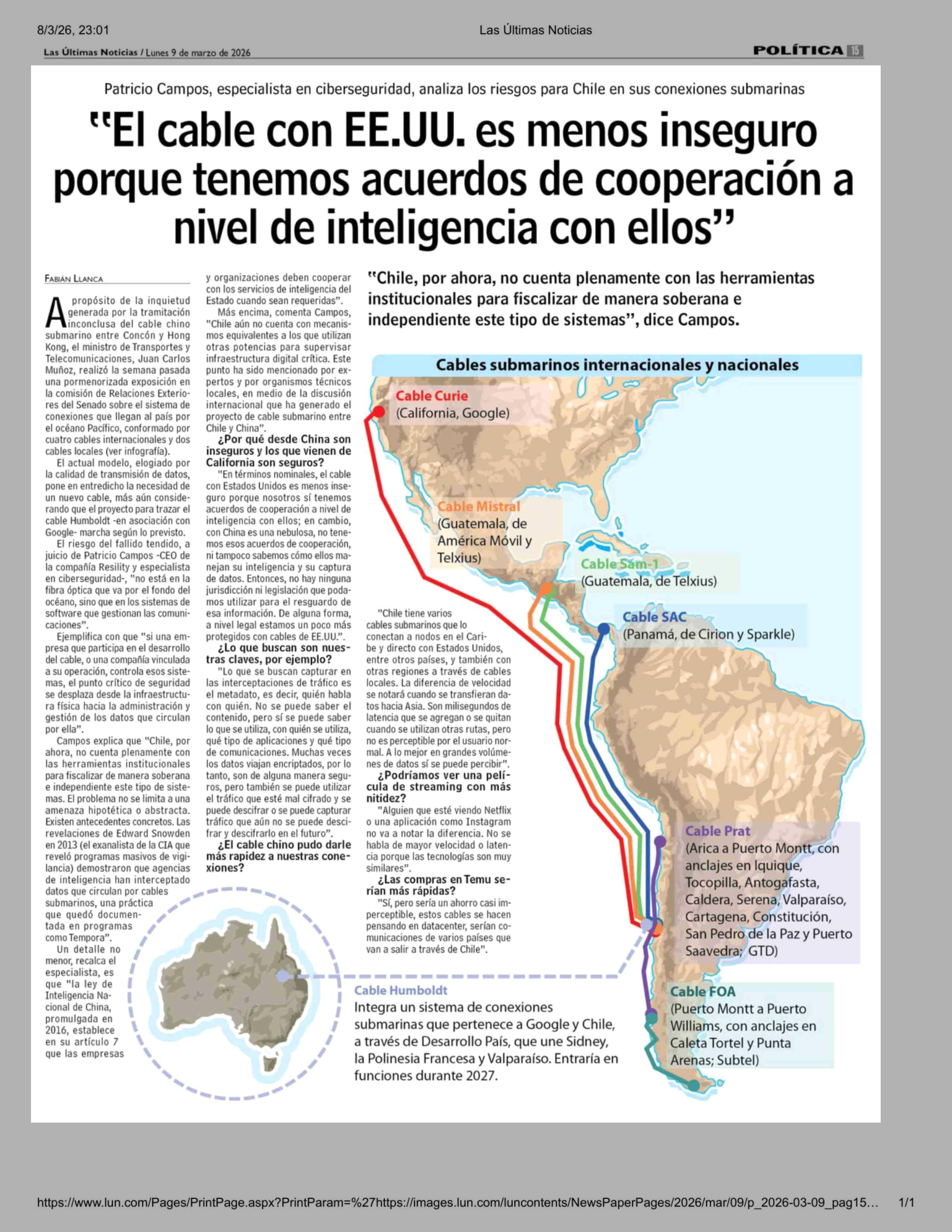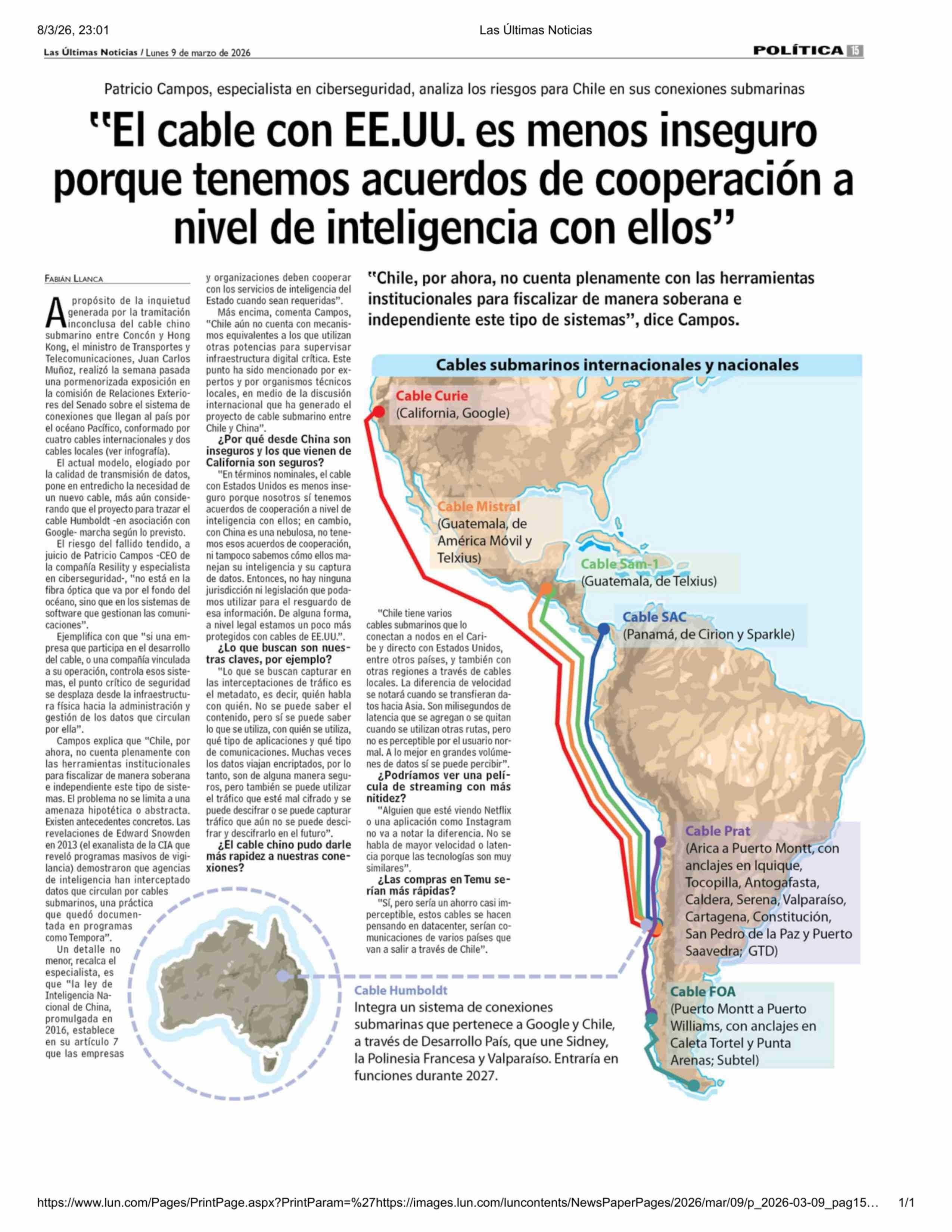 "El cable con EE.UU. es menos inseguro porque tenemos acuerdos de cooperación a nivel de inteligencia con ellos" 09-03-2026 Las Últimas Noticias |