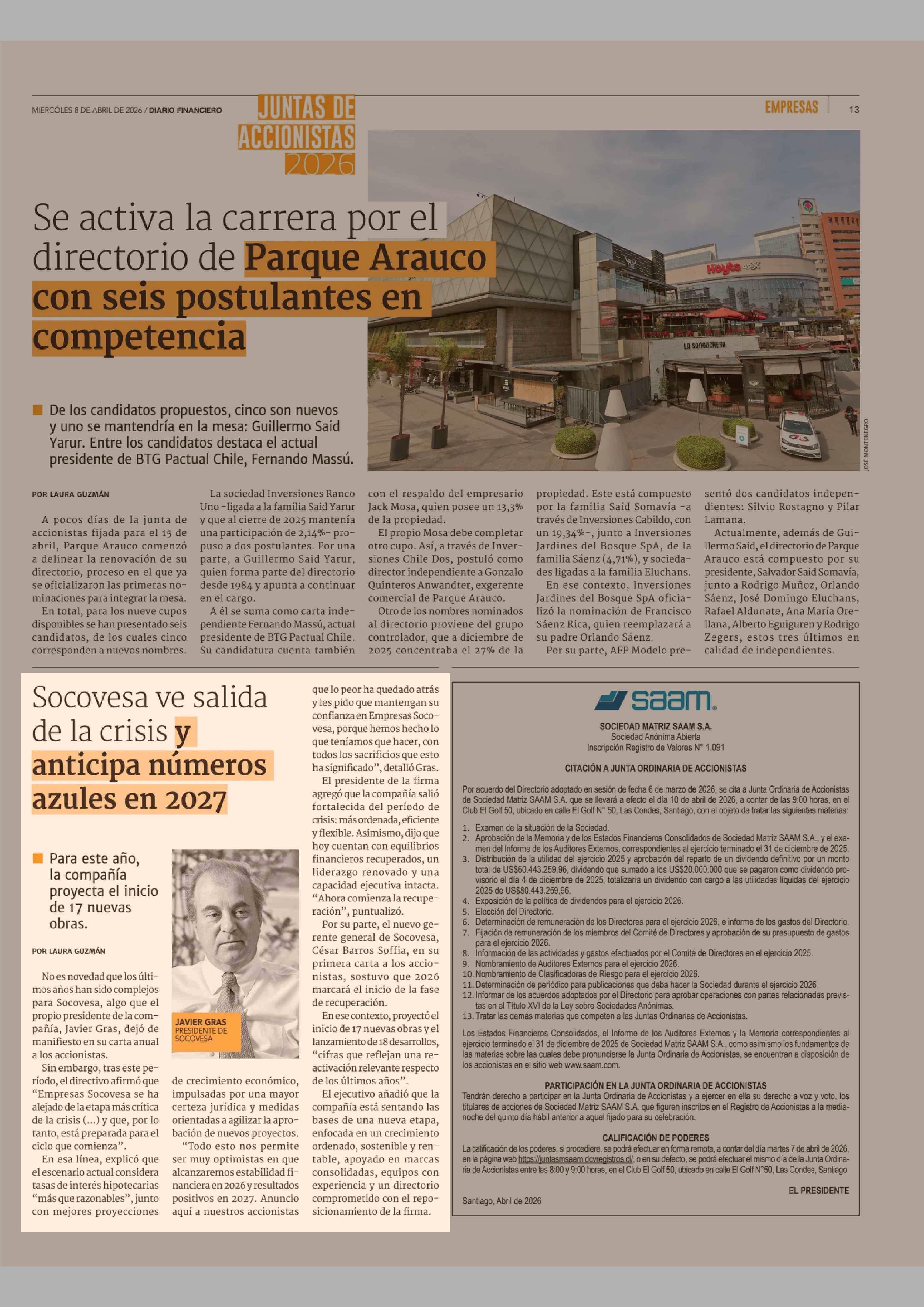 Socovesa ve salida de la crisis y anticipa números azules en 2027 08-04-2026 Diario Financiero |