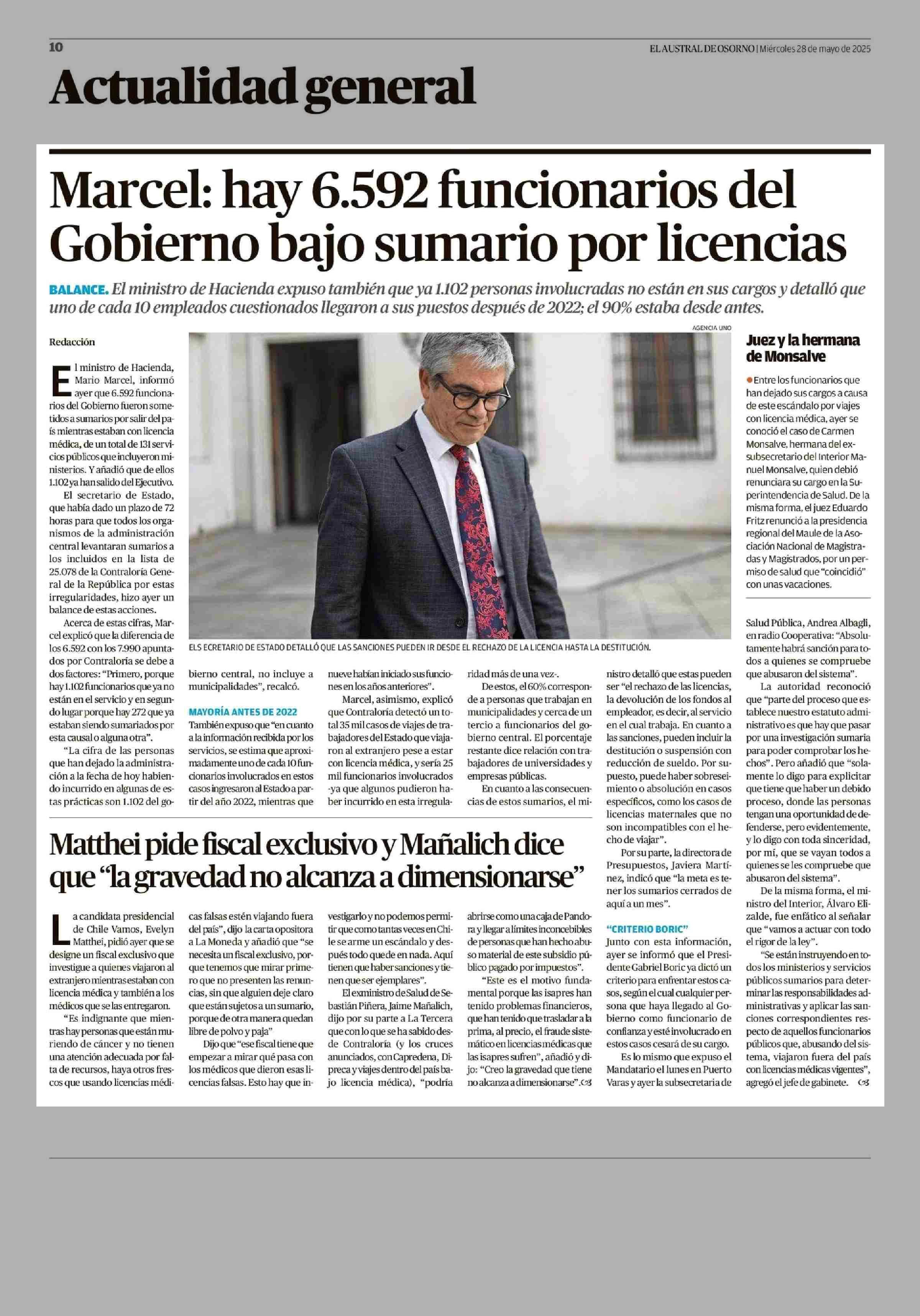 Marcel: hay 6.592 funcionarios del Gobierno bajo sumario por licencias 28-05-2025 El Austral de Osorno |
