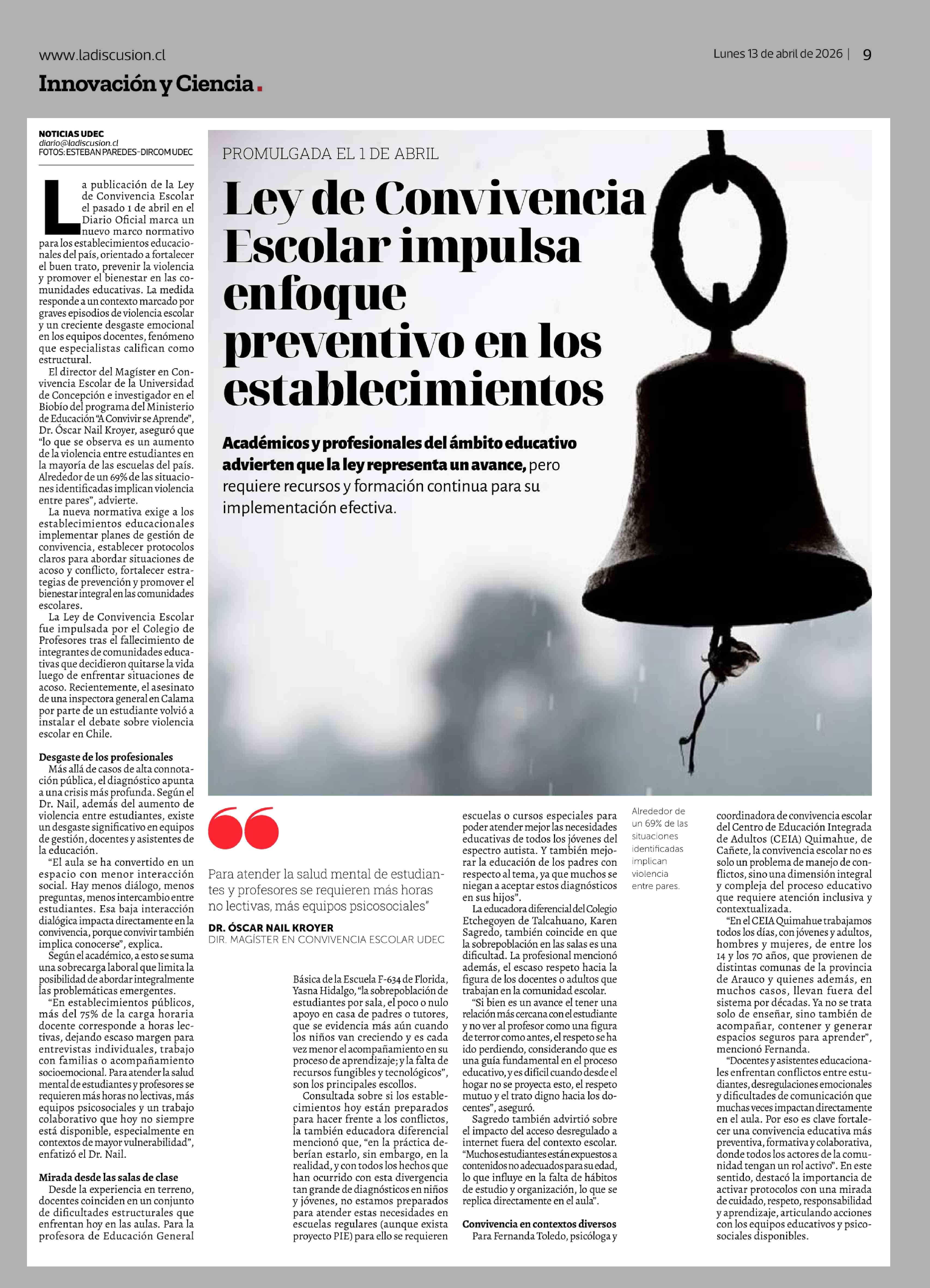 Ley de Convivencia Escolar impulsa enfoque preventivo en los establecimientos 13-04-2026 La Discusión |