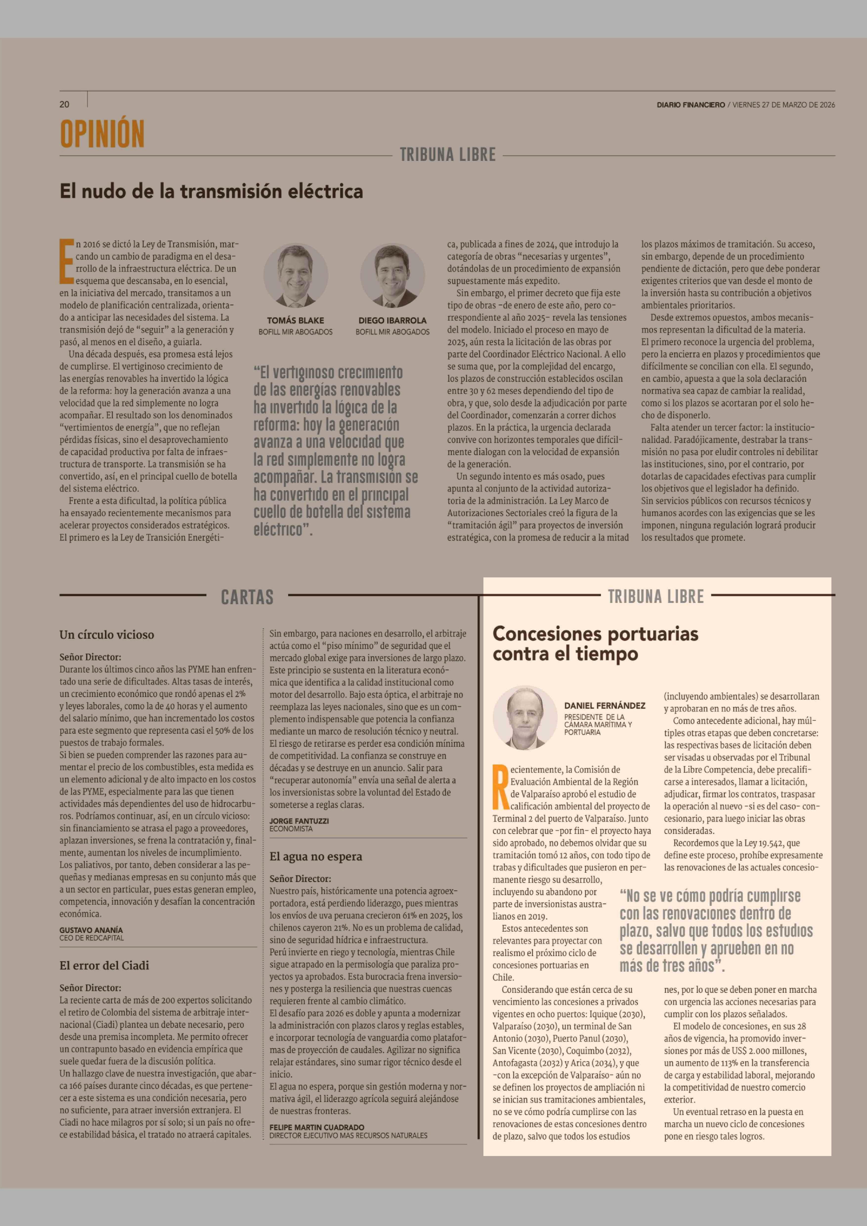 Columnas de Opinión: Concesiones portuarias contra el tiempo 27-03-2026 Diario Financiero |