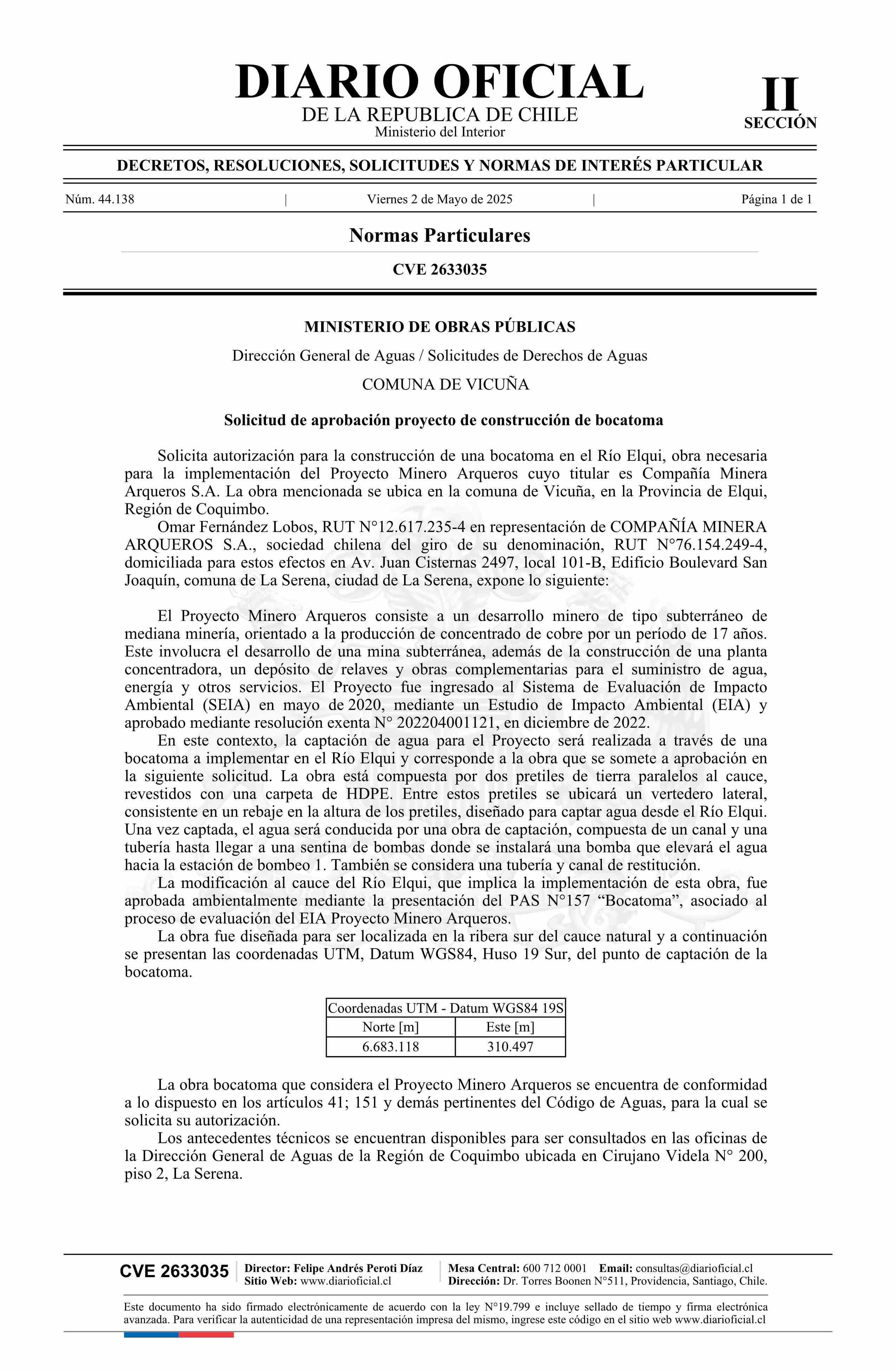 Solicitud Compañía Minera Arqueros S.A. 02-05-2025 Diario Oficial Edición Electrónica |