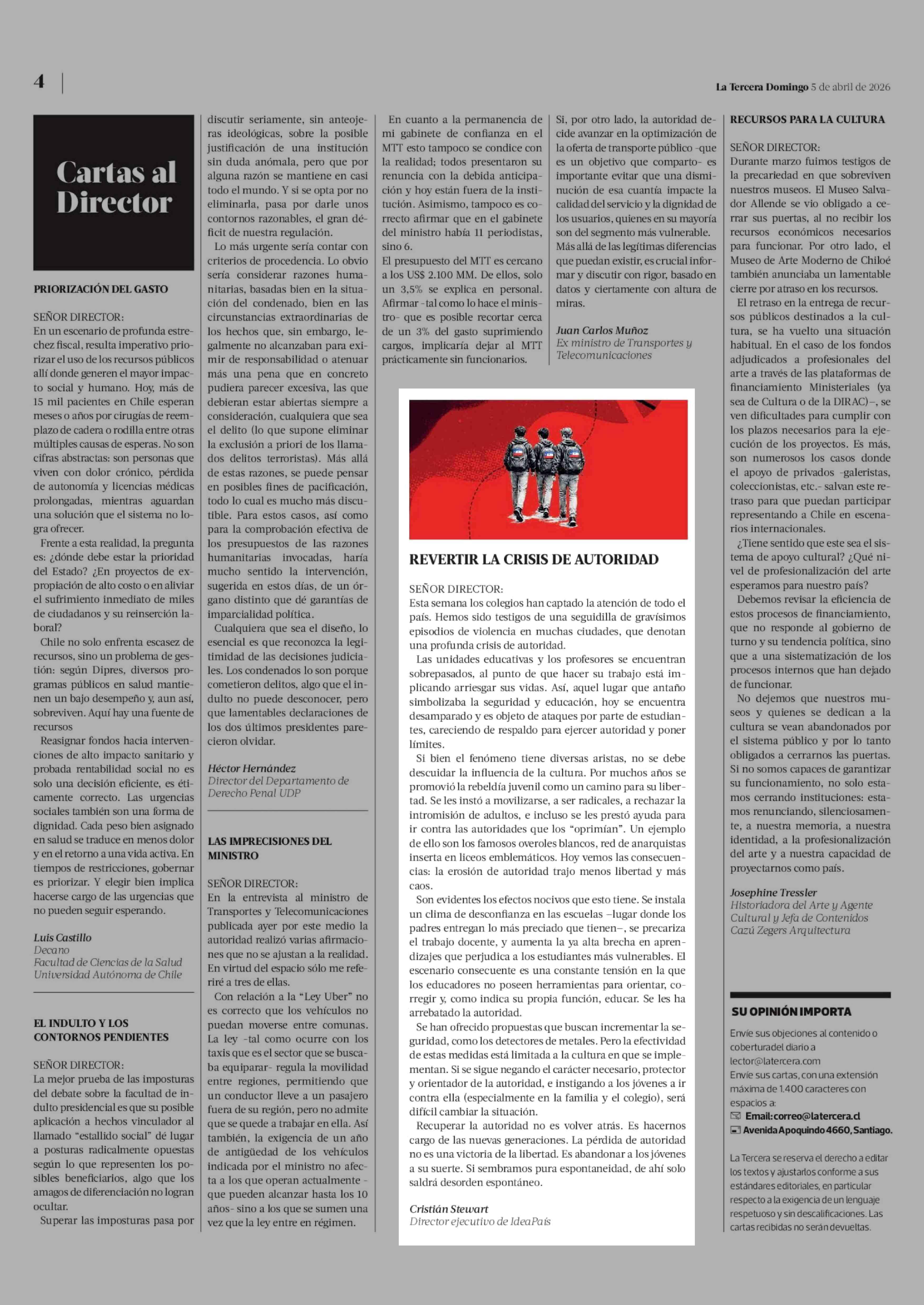 Cartas: REVERTIR LA CRISIS DE AUTORIDAD 05-04-2026 La Tercera |