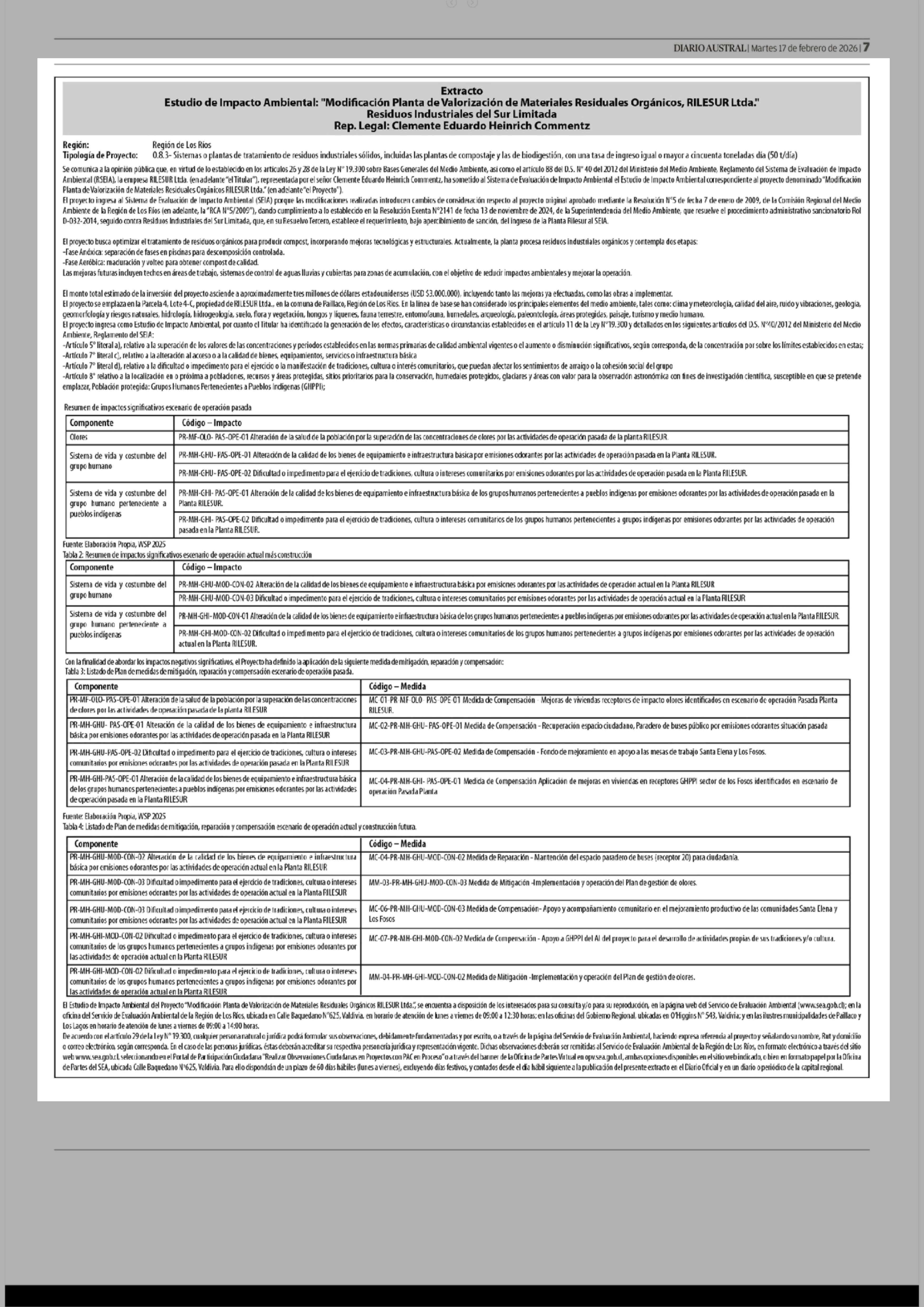 Título: Extractos: Extracto Estudio de Impacto Ambiental: "Modificación Planta de Valorización de Materiales Residuales Orgánicos, RILESUR Ltda." Residuos Industriales del Sur Limitada Rep. Legal: Clemente Eduardo Heinrich Commentz Región de Los Ríos 0.8.3- Sistemas o plantas de tratamiento de residuos indu