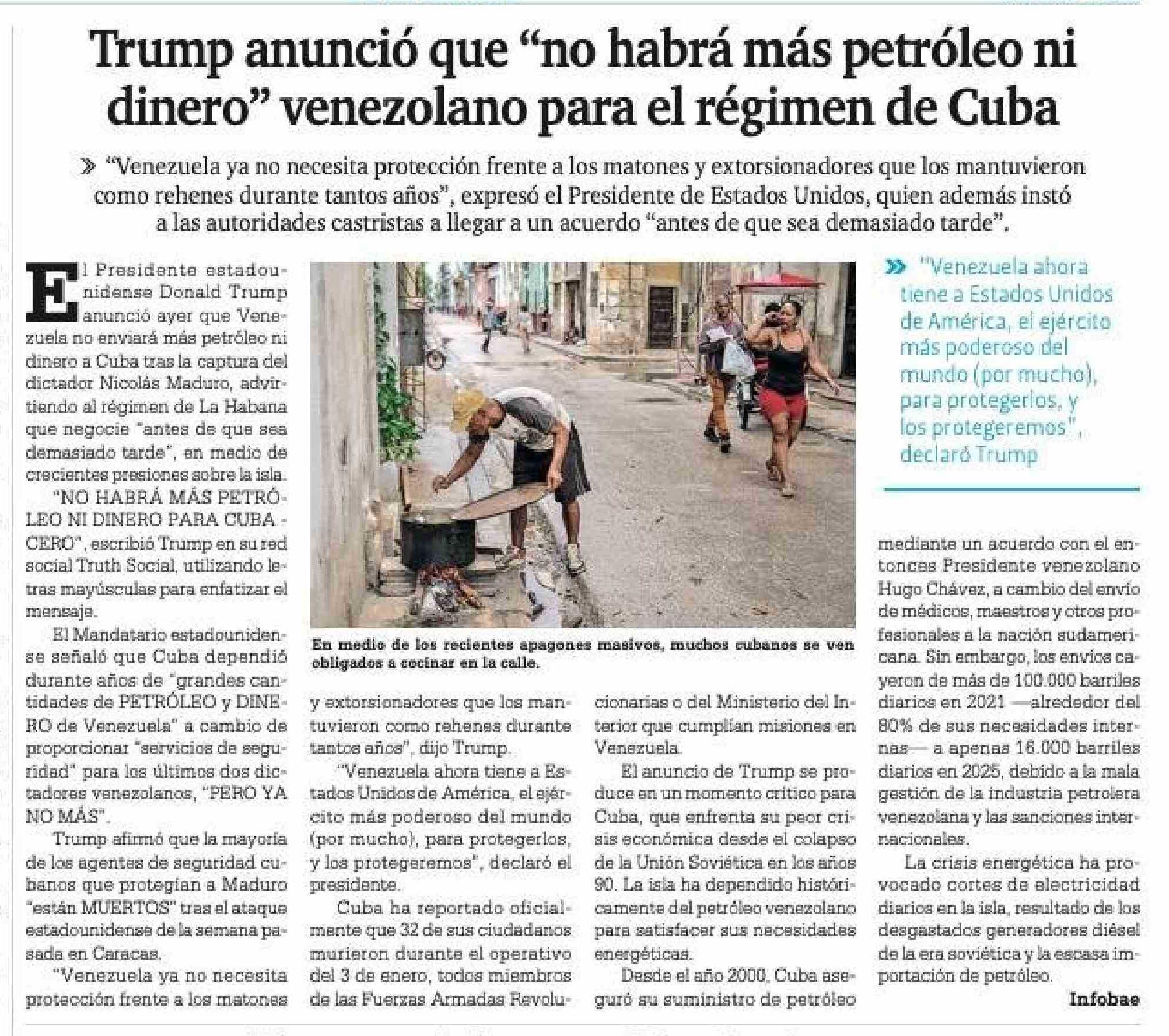 Título: Trump anunció que "no habrá más petróleo ni dinero" venezolano para el régimen de Cuba