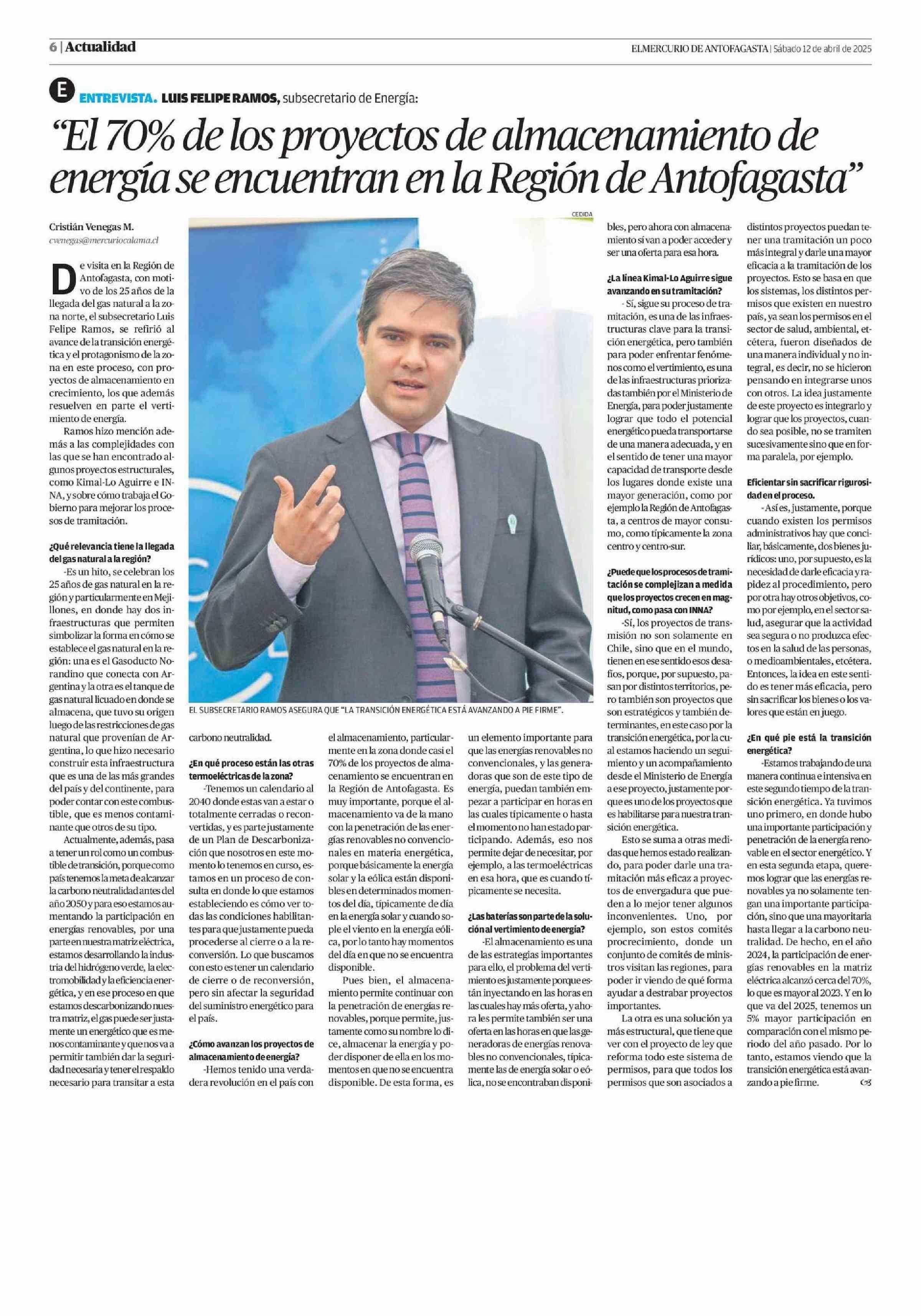 “El 70% de los proyectos de almacenamiento de energía se encuentran en la Región de Antofagasta” 12-04-2025 El Mercurio de Antofagasta |
