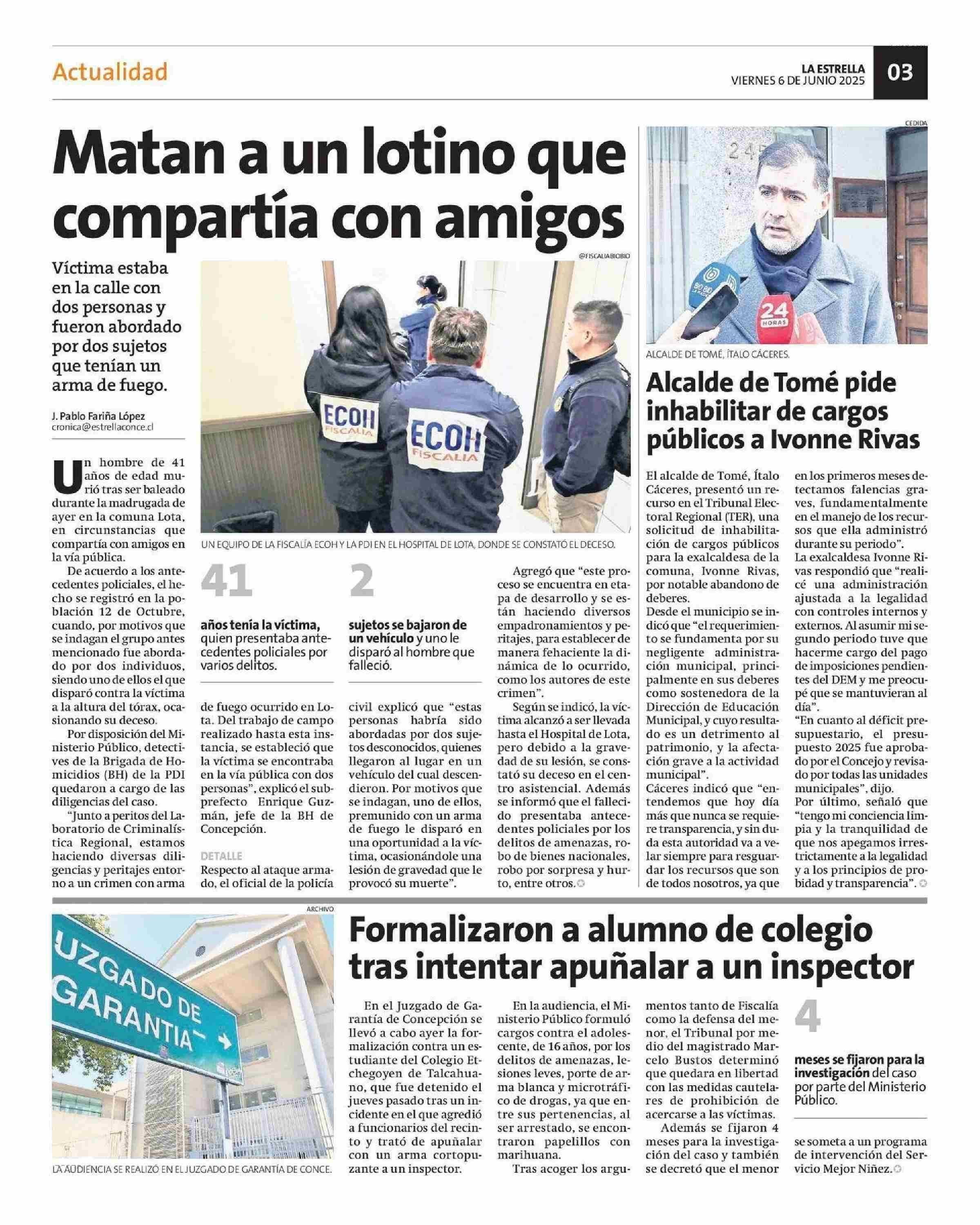 Alcalde de Tomé pide públicos a Ivonne Rivas inhabilitar de cargos 06-06-2025 La Estrella de Concepción |