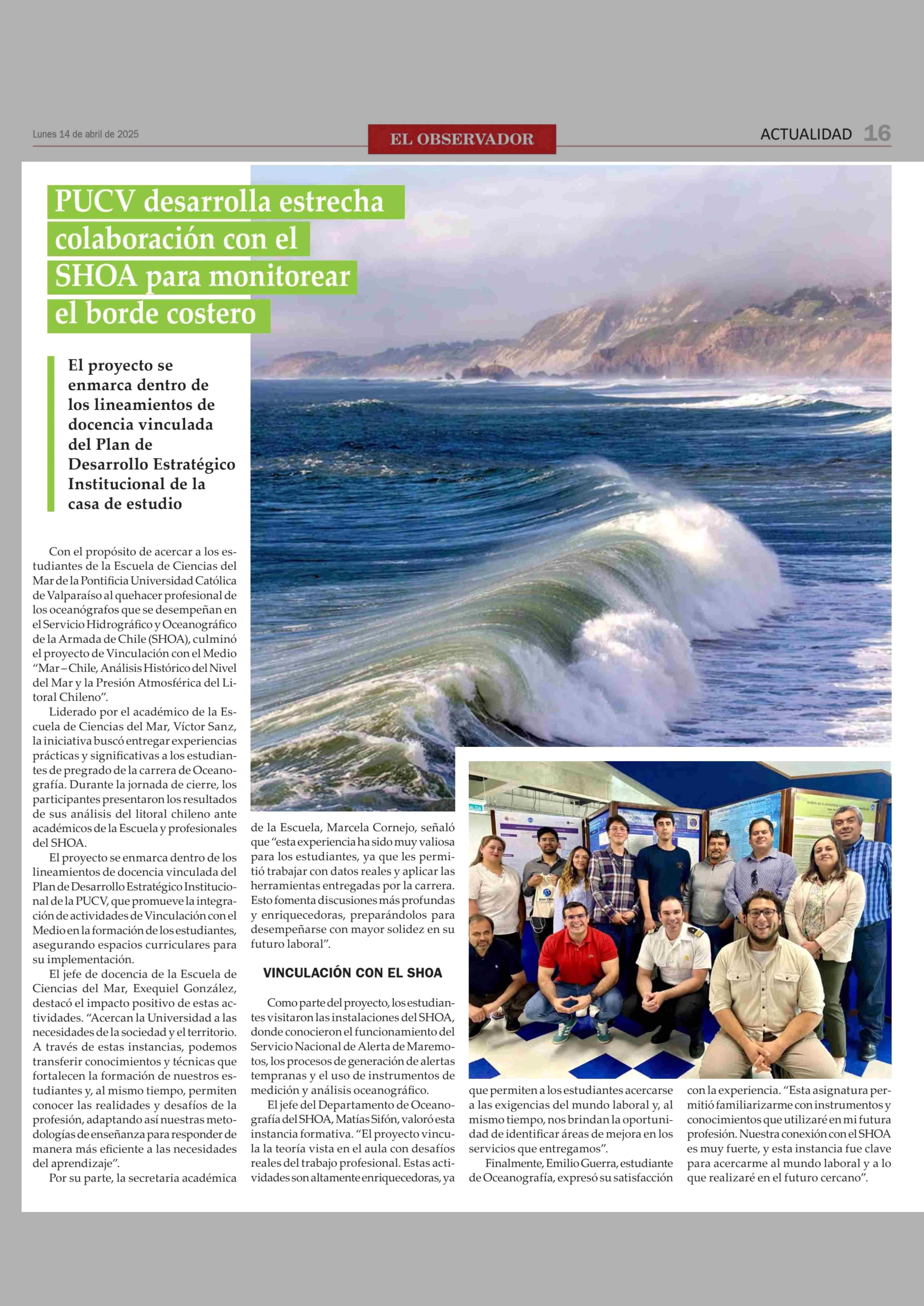 PUCV desarrolla estrecha colaboración con el SHOA para monitorear el borde costero 14-04-2025 El Observador Vespertino |