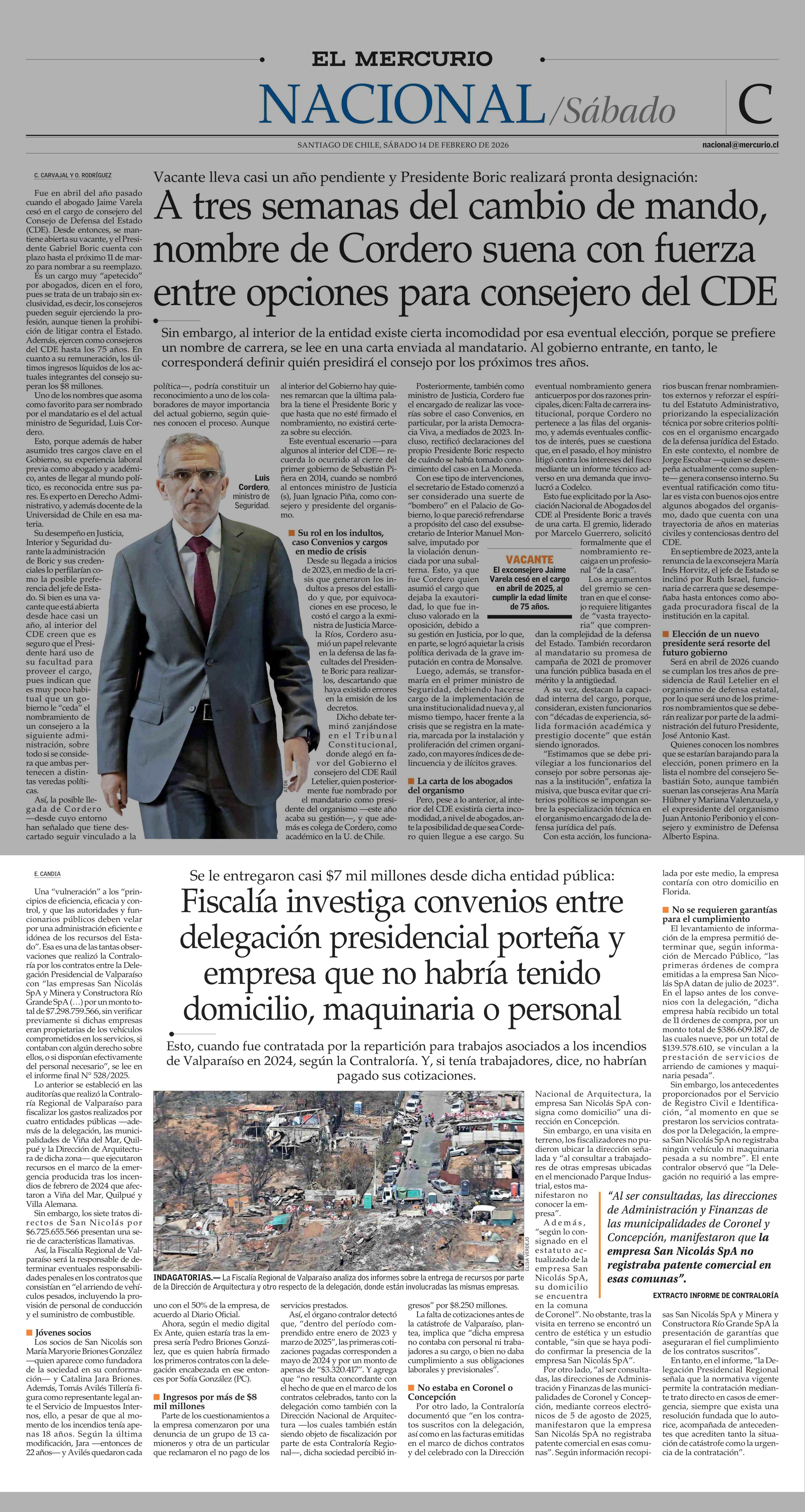 Fiscalía investiga convenios entre delegación presidencial porteña y empresa que no habría tenido domicilio, maquinaria o personal 14-02-2026 El Mercurio |