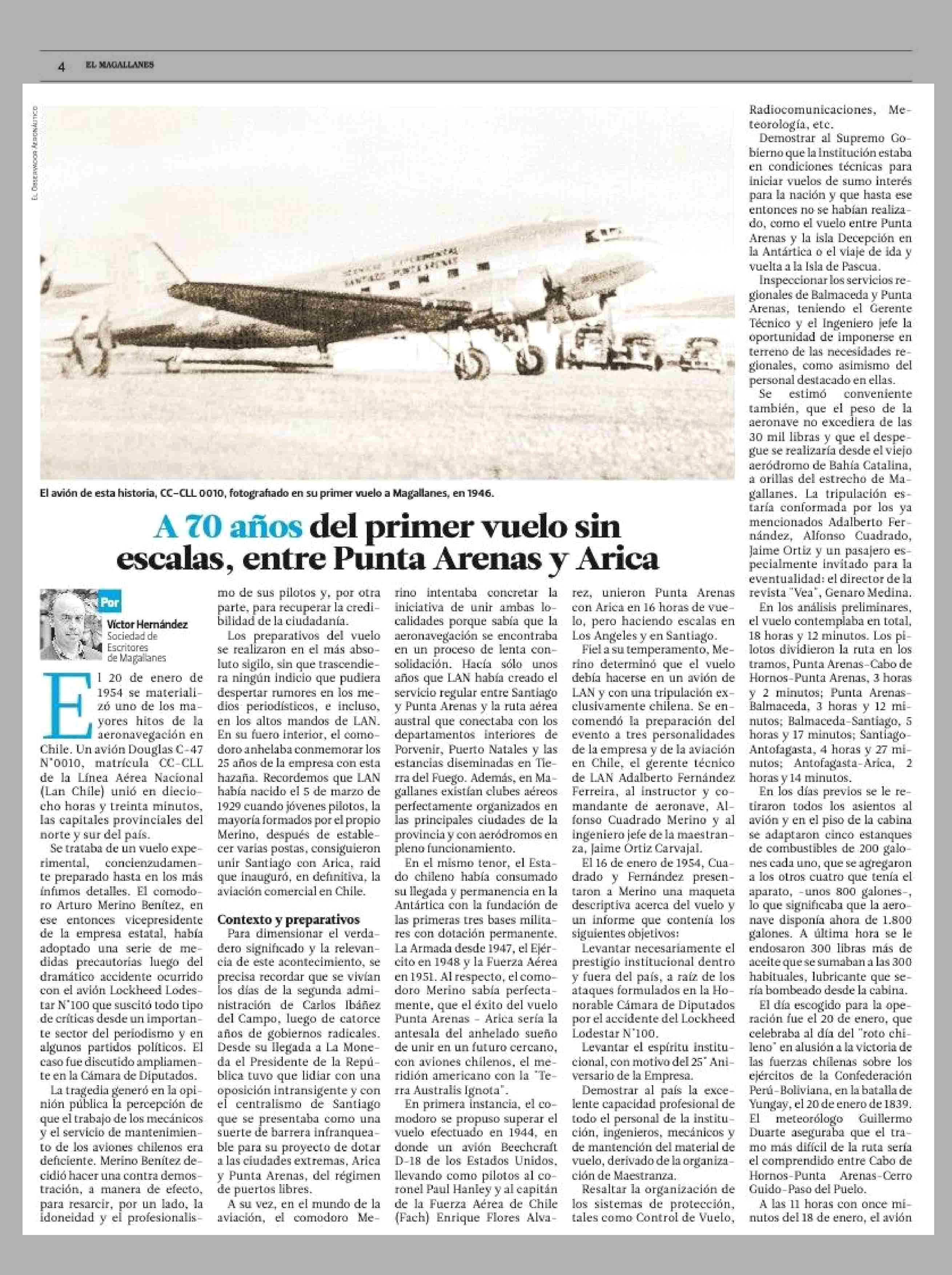 Título: A 7O años del primer vuelo sin escalas, entre Punta Arenas y Anca