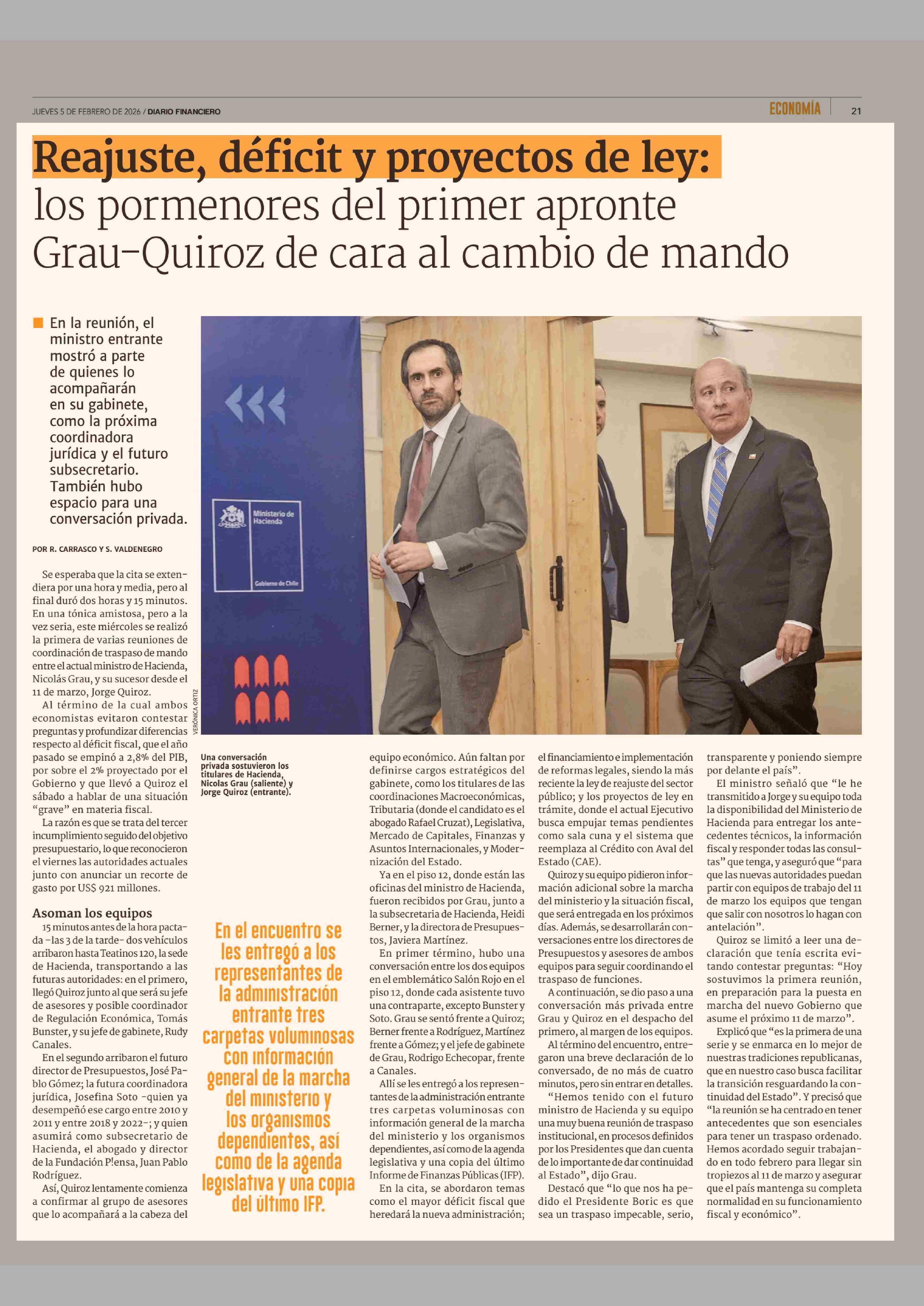 Reajuste, déficit y proyectos de ley: los pormenores del primer apronte Grau-Quiroz de cara al cambio de mando 05-02-2026 Diario Financiero |