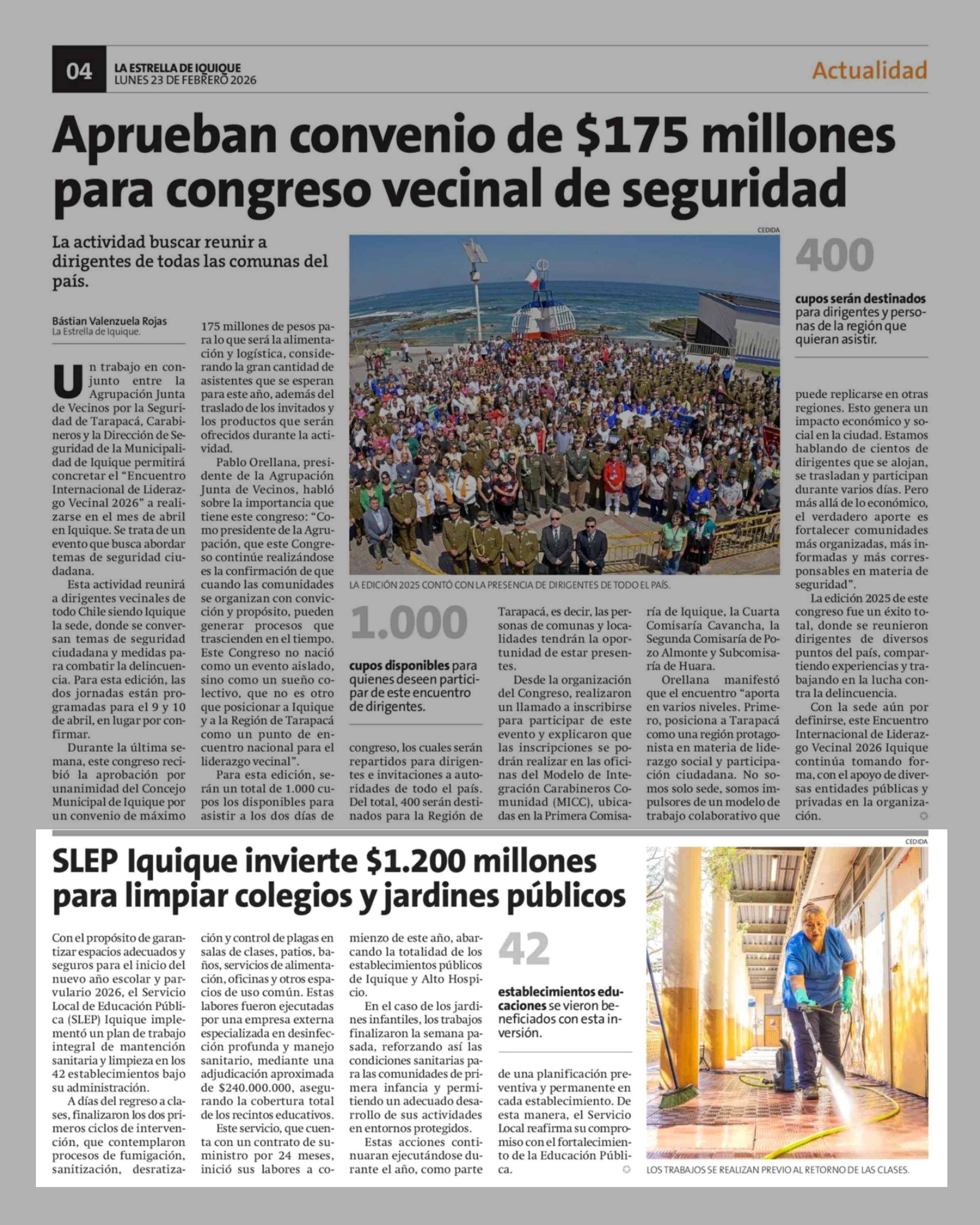 SLEP Iquique invierte $1.200 millones para limpiar colegios y jardines públicos 23-02-2026 La Estrella de Iquique |