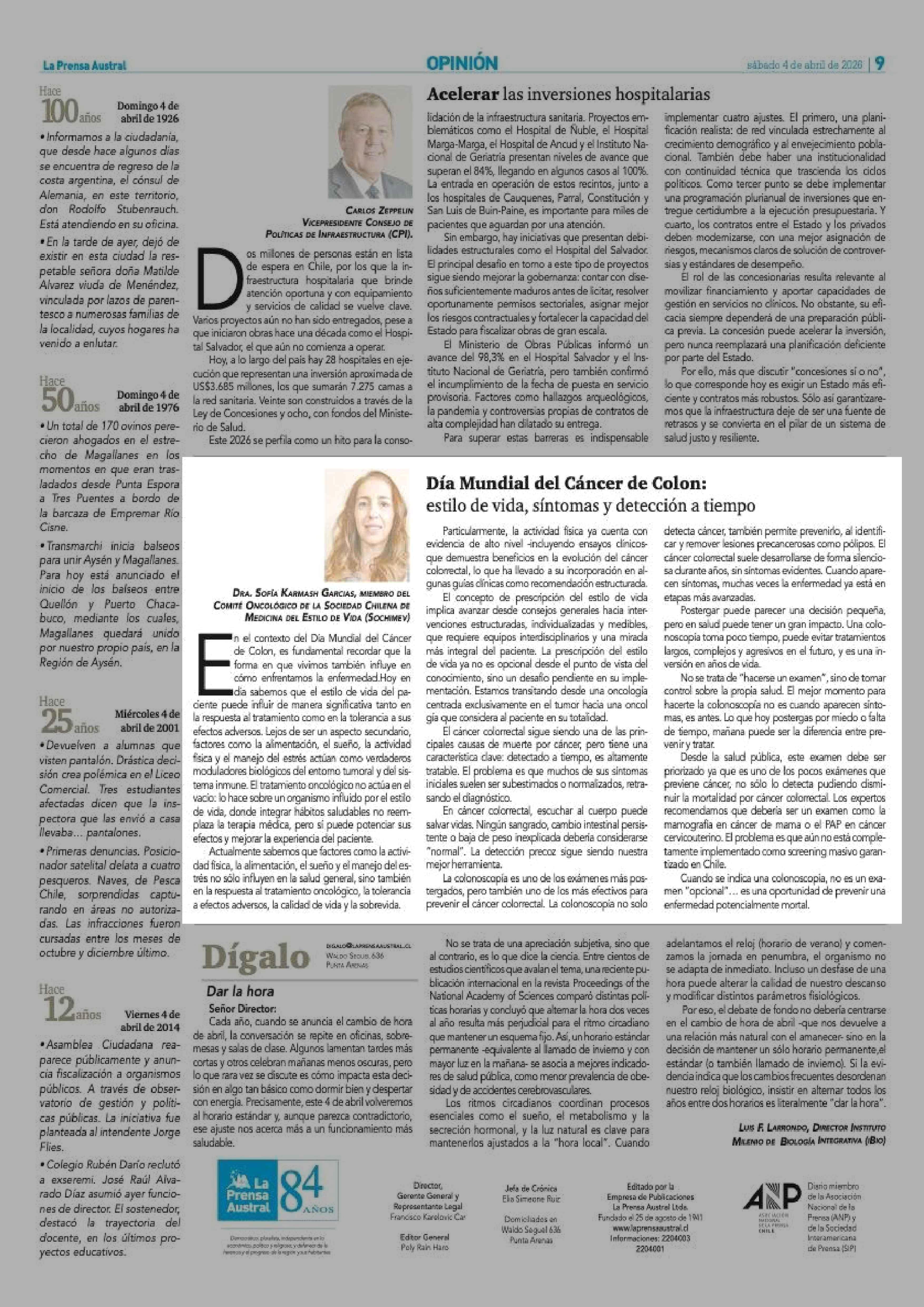 Columnas de Opinión: Día Mundial del Cáncer de Colon: estilo de vida, síntomas y detección a tiempo 04-04-2026 La Prensa Austral |